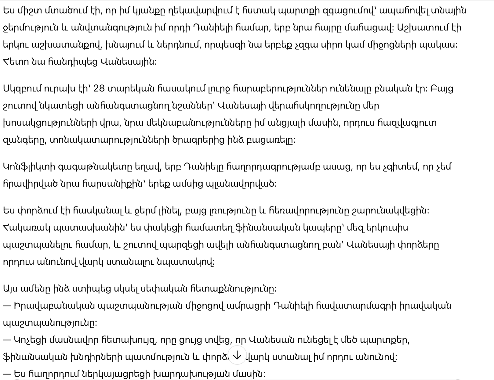 «Эти обвинения, которые ты выдвинула — фиктивные обвинения, расследование, всё это — причинило реальный вред. Кредитная история Дэниела пострадала. Его отношение к коллегам на работе стало напряженным из-за стресса. Нам пришлось нанять адвоката, чтобы защищаться от вашего заявления в полицию».