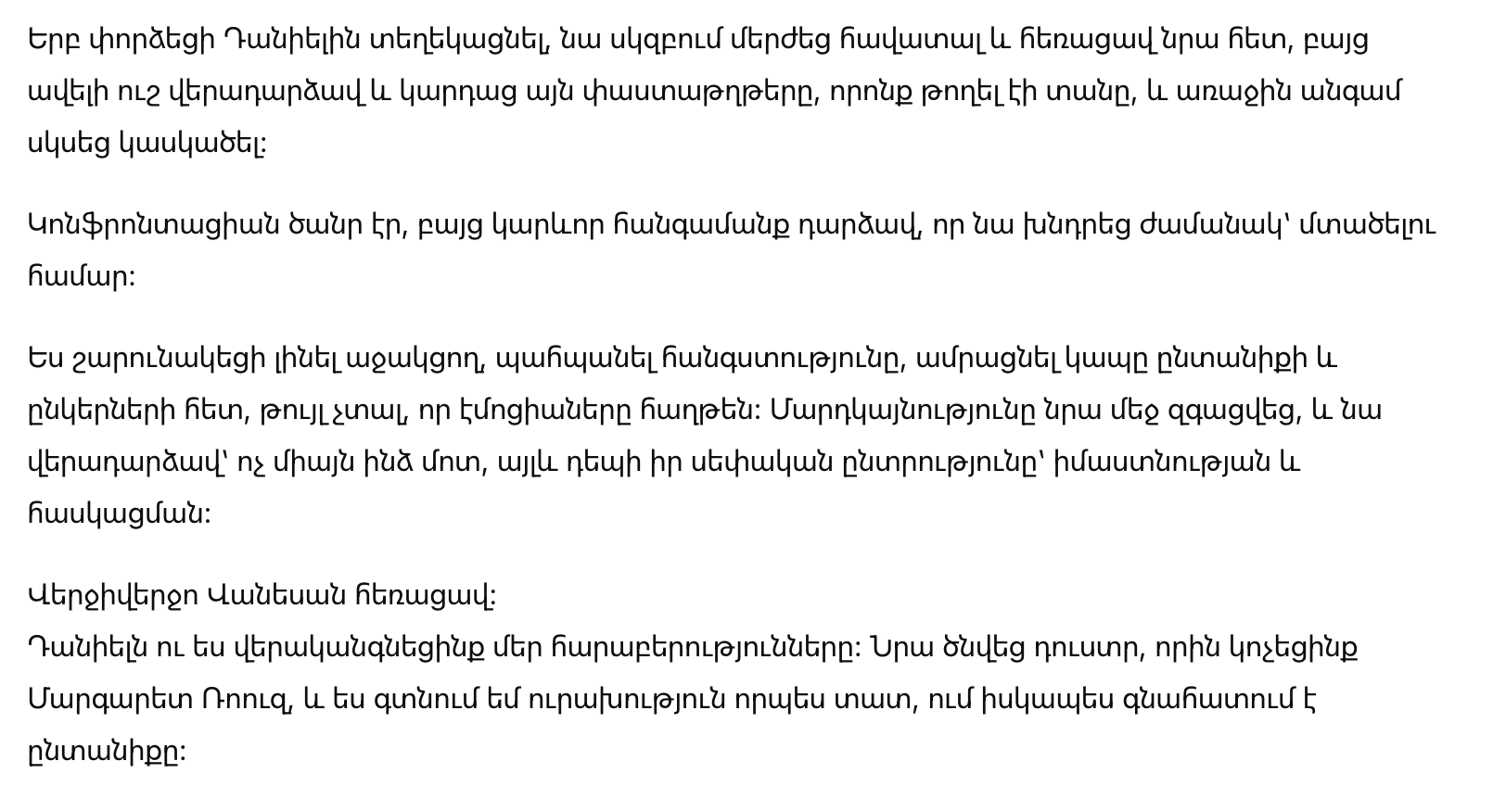 «Маргарет, мы много размышляли», — начала она с медом в голосе. «Дэниел был абсолютно расстроен этой неприязнью. Он так любит тебя, и это расставление разбивает ему сердце».