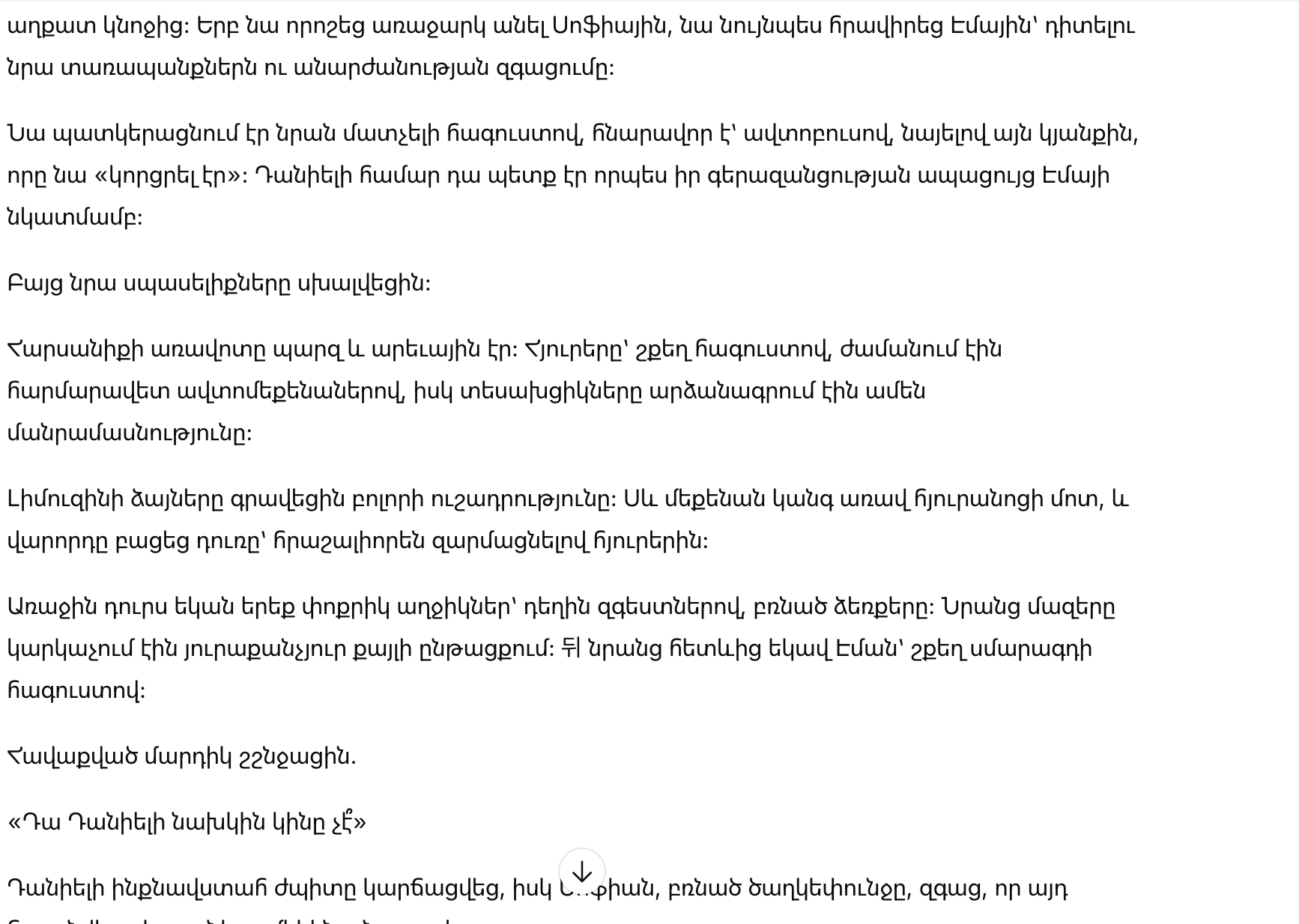 Он представлял, как она в недорогой одежде, возможно, на автобусе, будет наблюдать издали за жизнью, которую когда-то “потеряла”. Для Даниэля это стало бы доказательством его превосходства над Эммой.