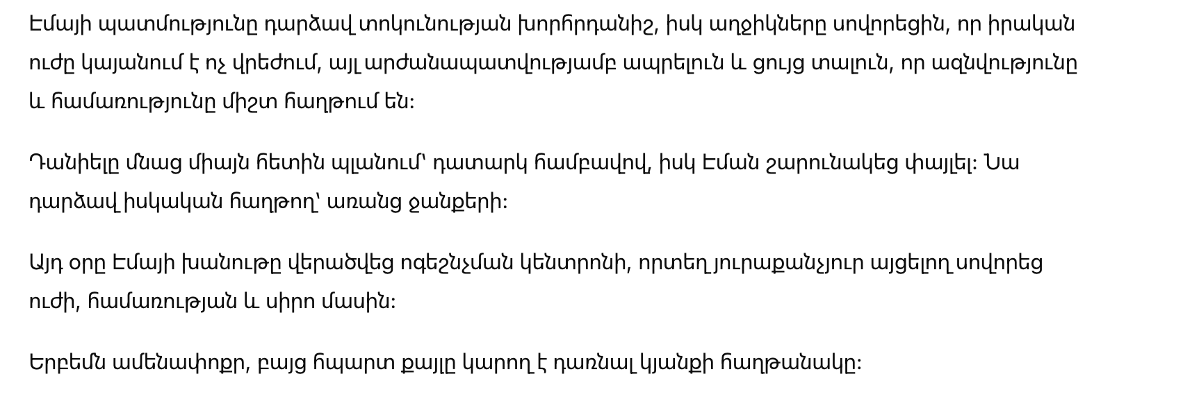 Эмма наконец обрела мир. Она осознала, что несмотря на все страдания, они не определяют её жизнь. Ее сила и любовь к дочерям превратили невзгоды в историю о триумфе.