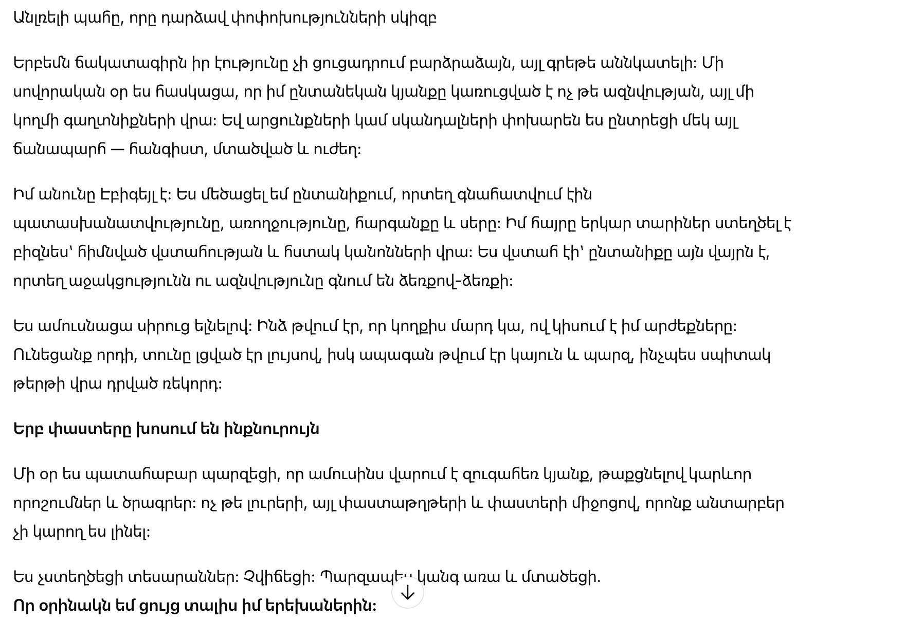 Меня зовут Абигейл. Я выросла в семье, где ценили ответственность, здоровье, уважение и любовь. Мой отец много лет создавал бизнес, основанный на доверии и чётких правилах. Я была уверена: семья — это место, где поддержка и честность идут рядом.