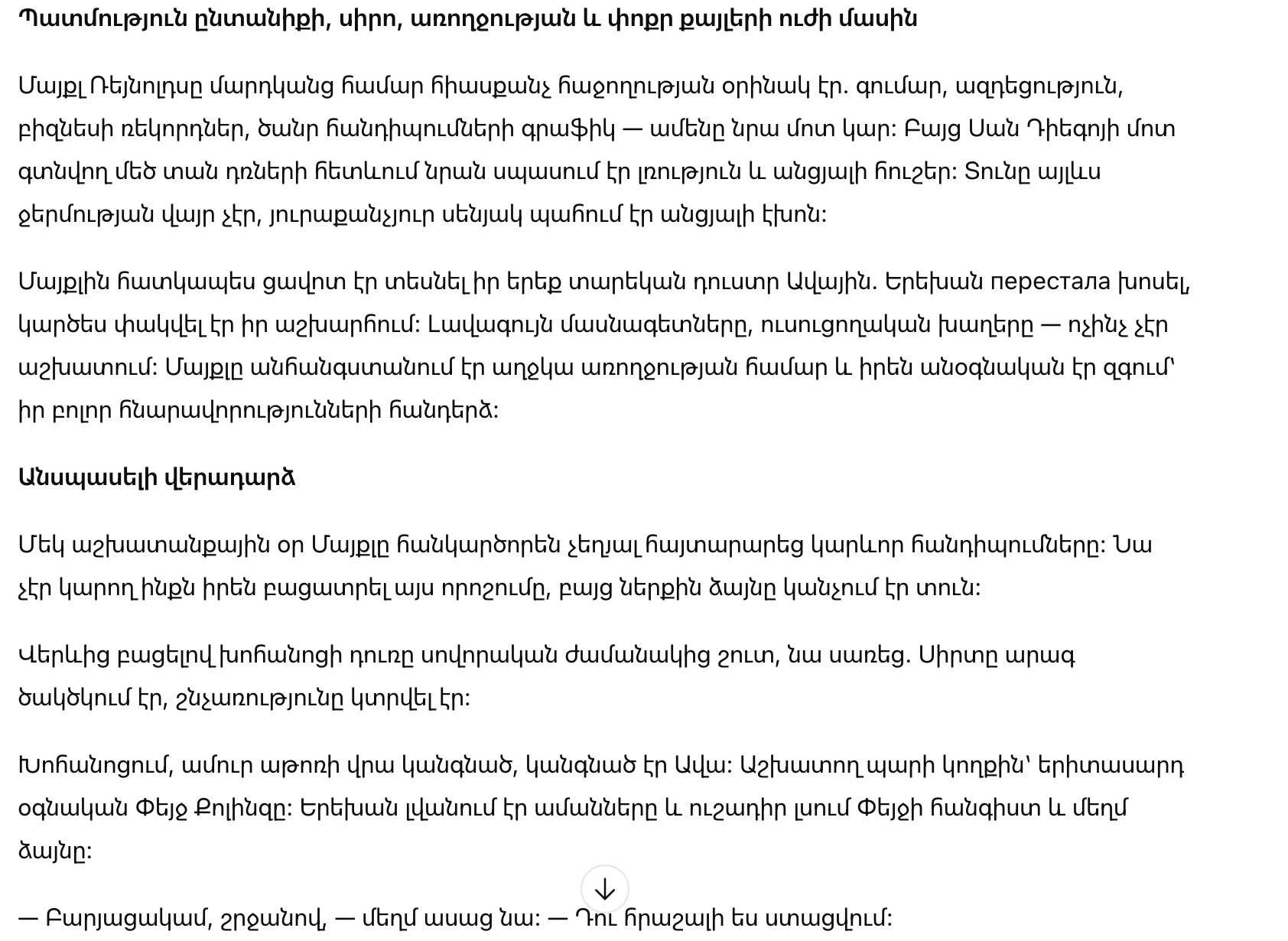 Особенно больно Майклу было видеть свою трёхлетнюю дочь Аву. Девочка перестала говорить, словно закрылась в собственном мире. Лучшие специалисты, занятия, развивающие игры — всё это не приносило ожидаемого результата. Майкл переживал за здоровье дочери и чувствовал себя беспомощным, несмотря на все свои возможности.