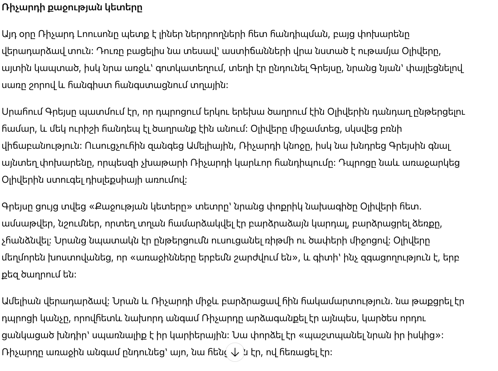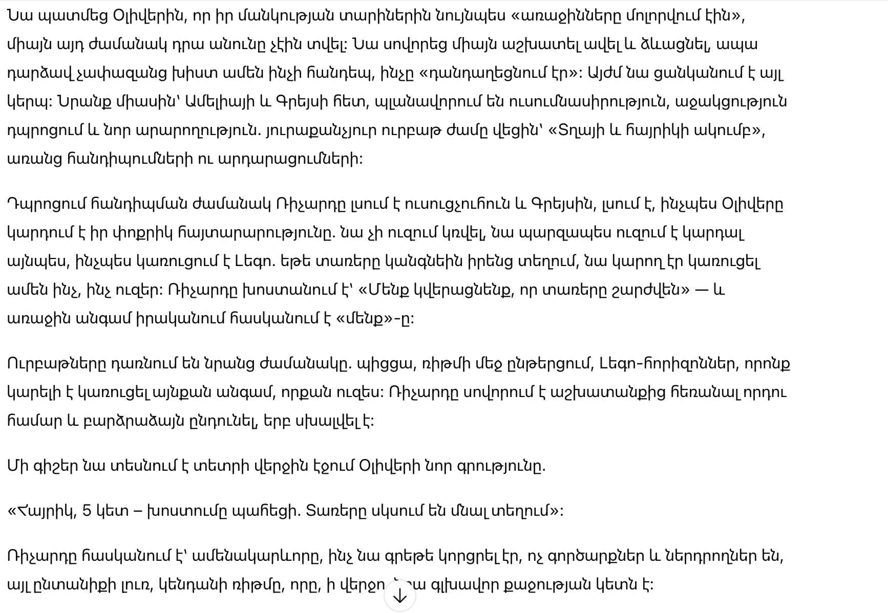 Ричард повернулся к Оливеру. «Когда мне было твоё лето,» начал он, и даже его удивила, что он это говорит, «линии ускользали от меня. Буквы казались насекомыми в банке. Я… не знал, как это называется. Я просто научился работать больше. И притворяться.»
