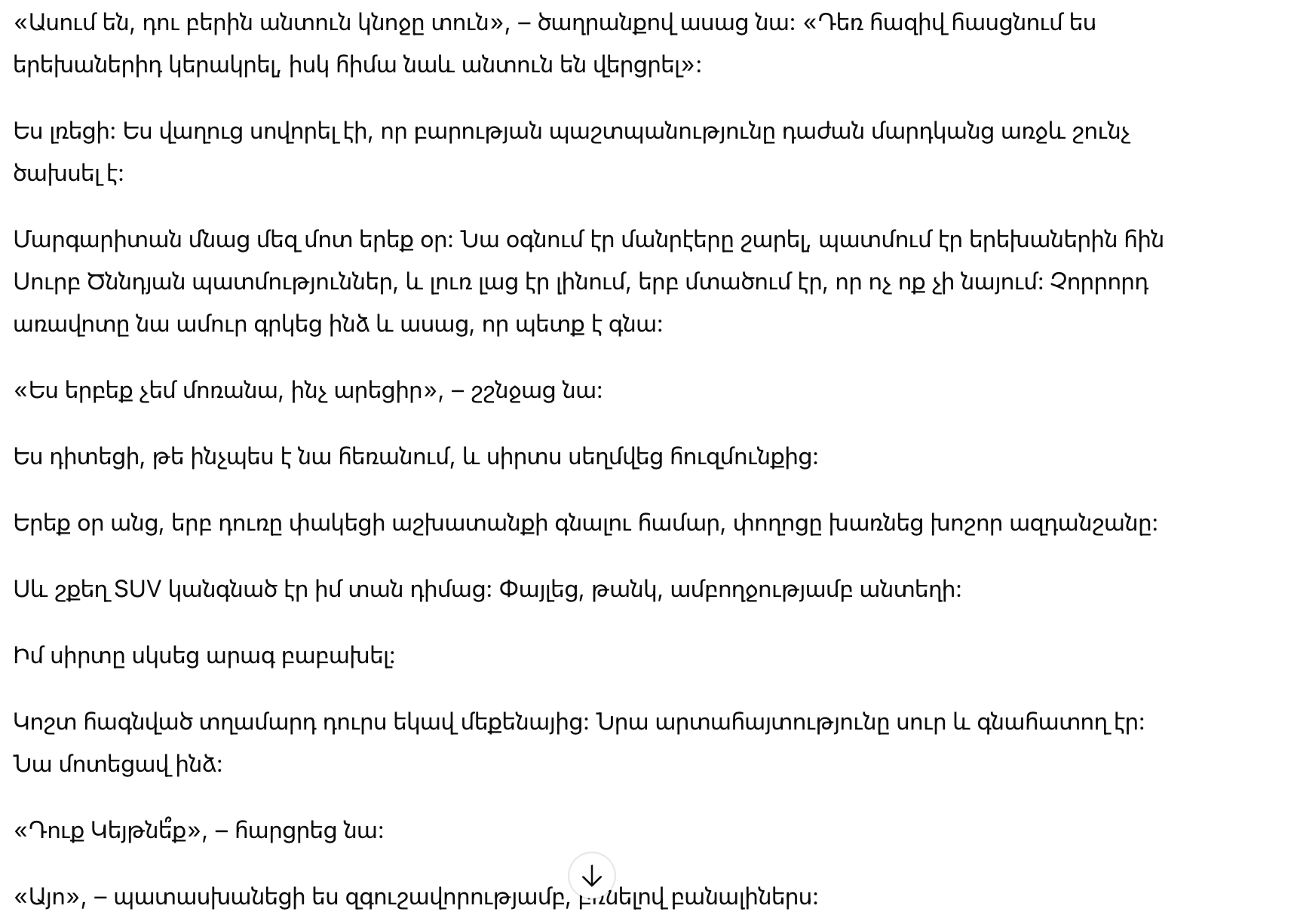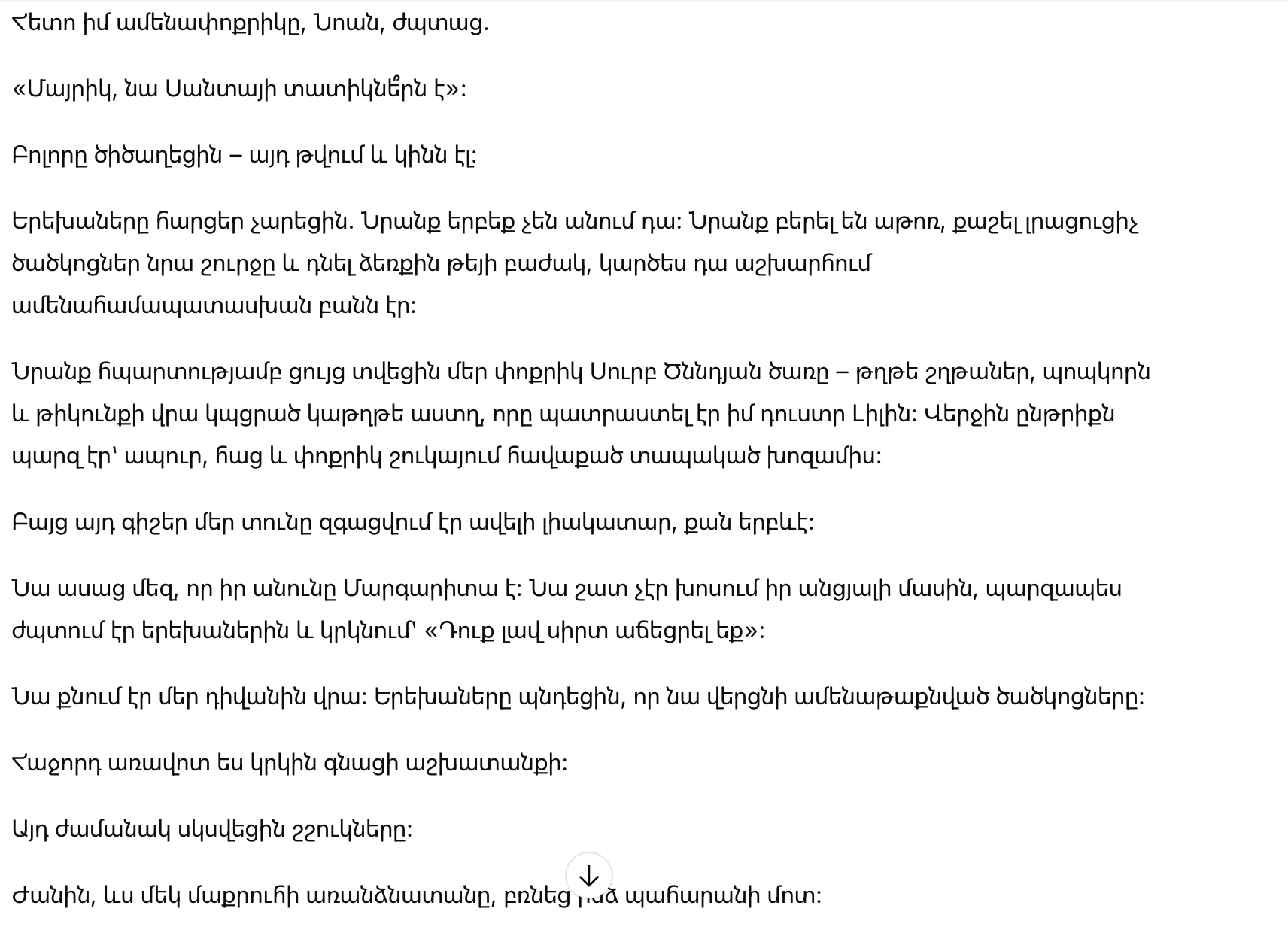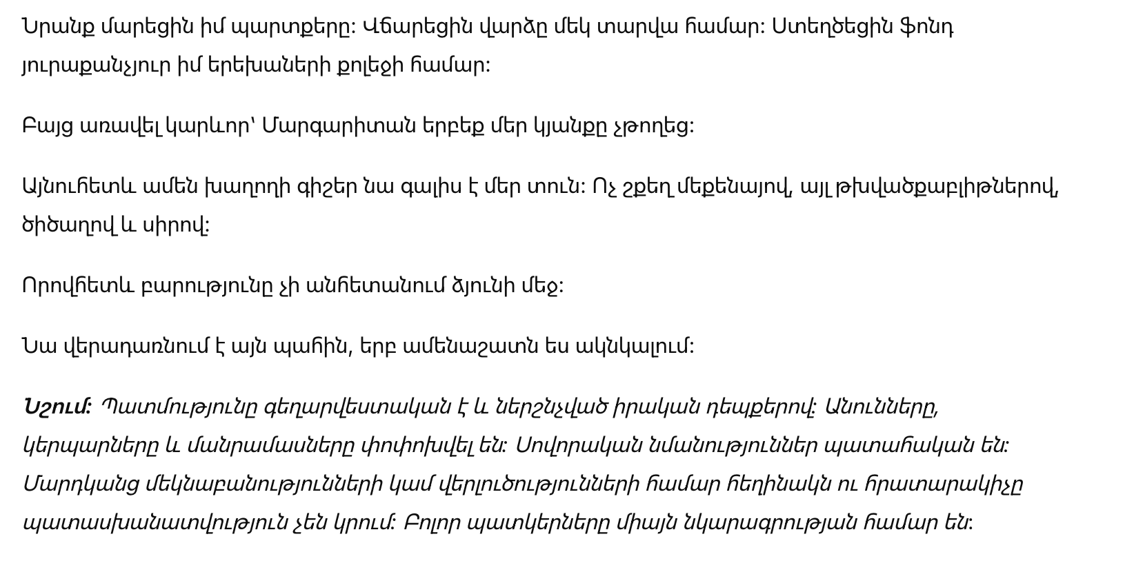Она сказала нам, что ее зовут Маргарита. Она не сильно говорила о своем прошлом, только улыбалась детям и повторяла: «Вы воспитали добрые сердца.»