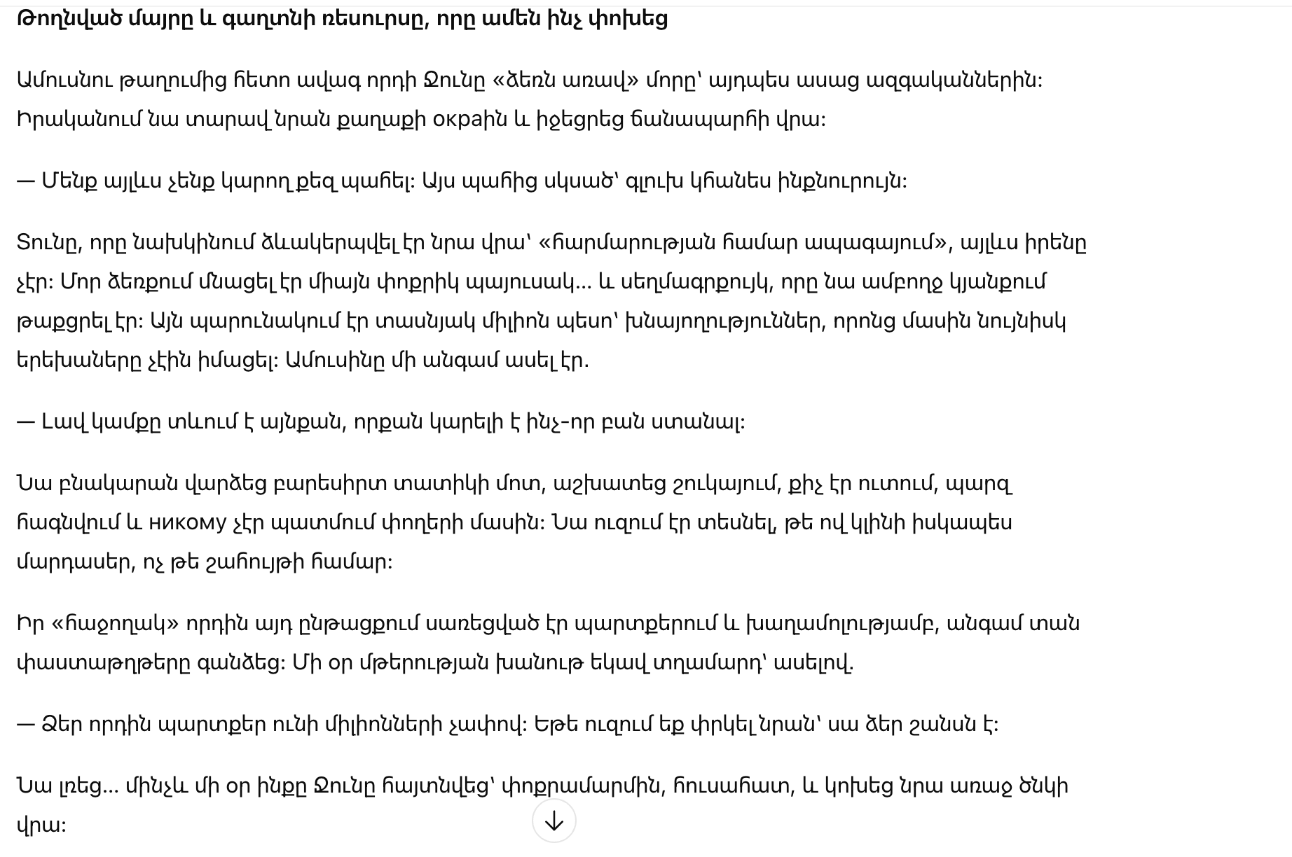 Я не просила Джуна о помощи. Не бегала за ним. Не унижалась. Это не была гордость — это была ясность. Я хотела увидеть, сколько он будет готов идти дальше. Я хотела понять, что жизнь научит его тому, чего я, как мать, не смогла ему объяснить.