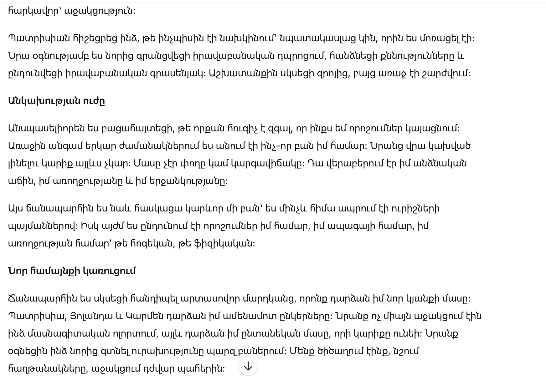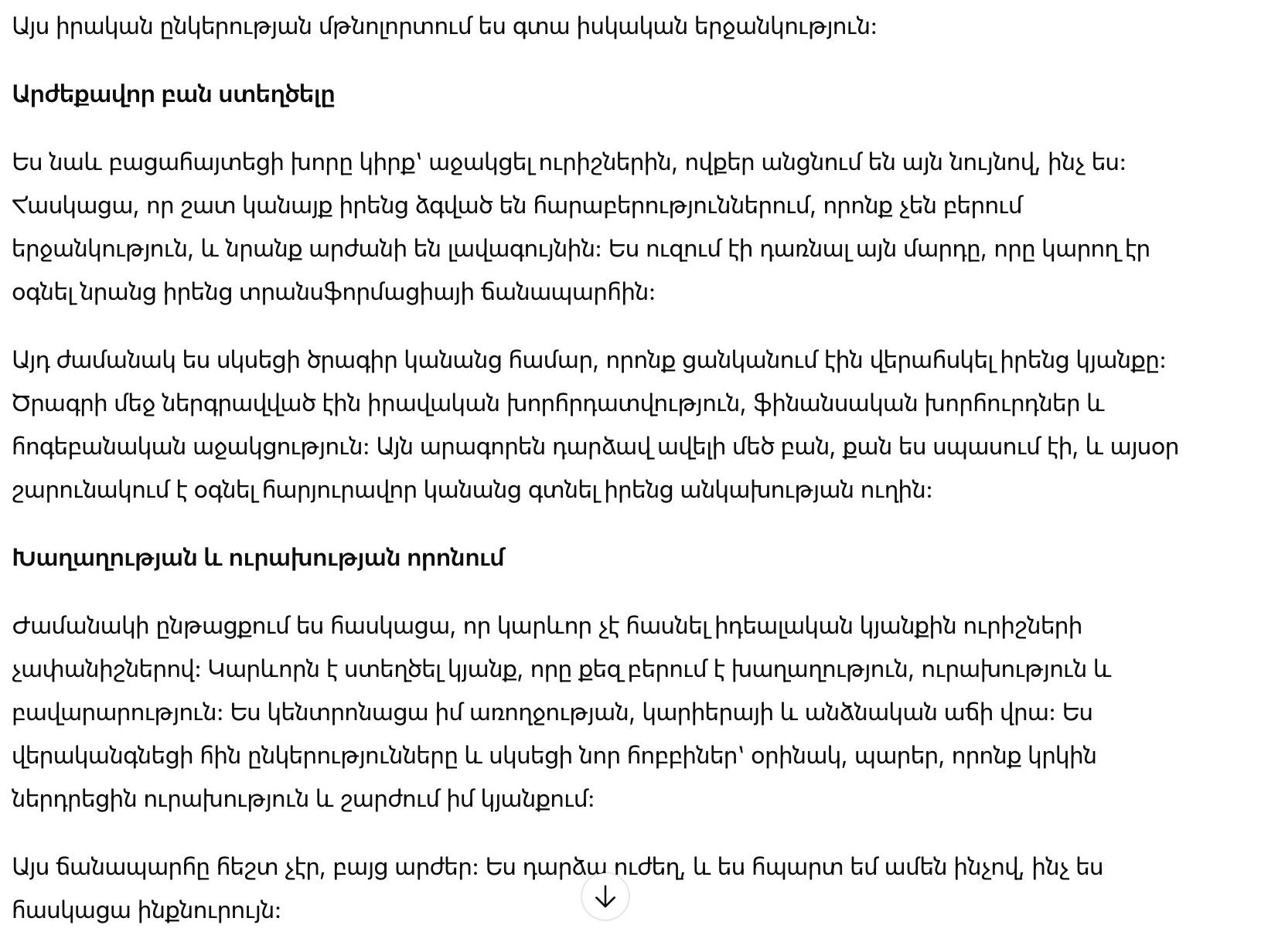 Именно тогда я начала программу для женщин, которые хотят вернуть контроль над своей жизнью. Программа предоставляла юридические консультации, финансовые советы и эмоциональную поддержку. Это быстро стало чем-то гораздо большим, чем я ожидала, и сегодня она продолжает помогать сотням женщин найти свой путь к независимости.