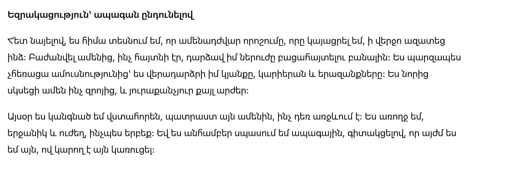 Сегодня я стою уверенно, готовая к тому, что будет дальше. Я здорова, счастлива и сильна, как никогда раньше. И я с нетерпением жду будущее, зная, что теперь я сама могу его строить.