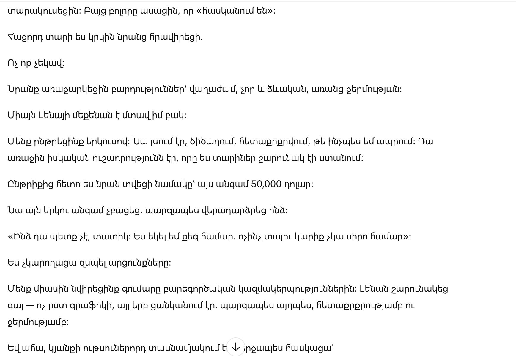 «Мне это не нужно,» – сказала она мягко. «Я пришла, потому что хотела увидеть тебя, это не зависит от денег. Не нужно вознаграждать меня за любовь к тебе».
