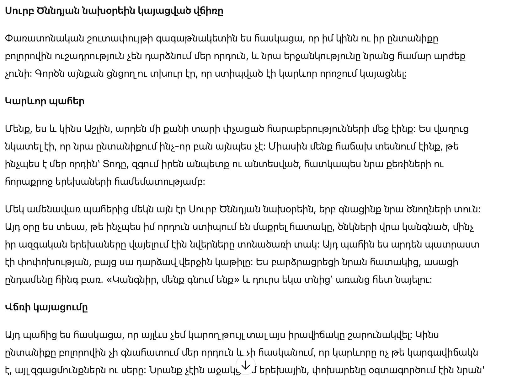 Один из самых ярких моментов случился накануне Рождества, когда мы приехали к её родителям. В тот день мне пришлось увидеть, как моего сына заставляют чистить полы, стоя на коленях, в то время как остальные дети, его кузены, наслаждались подарками под ёлкой. На этот момент я уже был готов к переменам, но это стало последней каплей. Я поднял его с пола, сказал всего пять слов: “Вставай, мы уходим”, и вышел из дома, не оглядываясь.