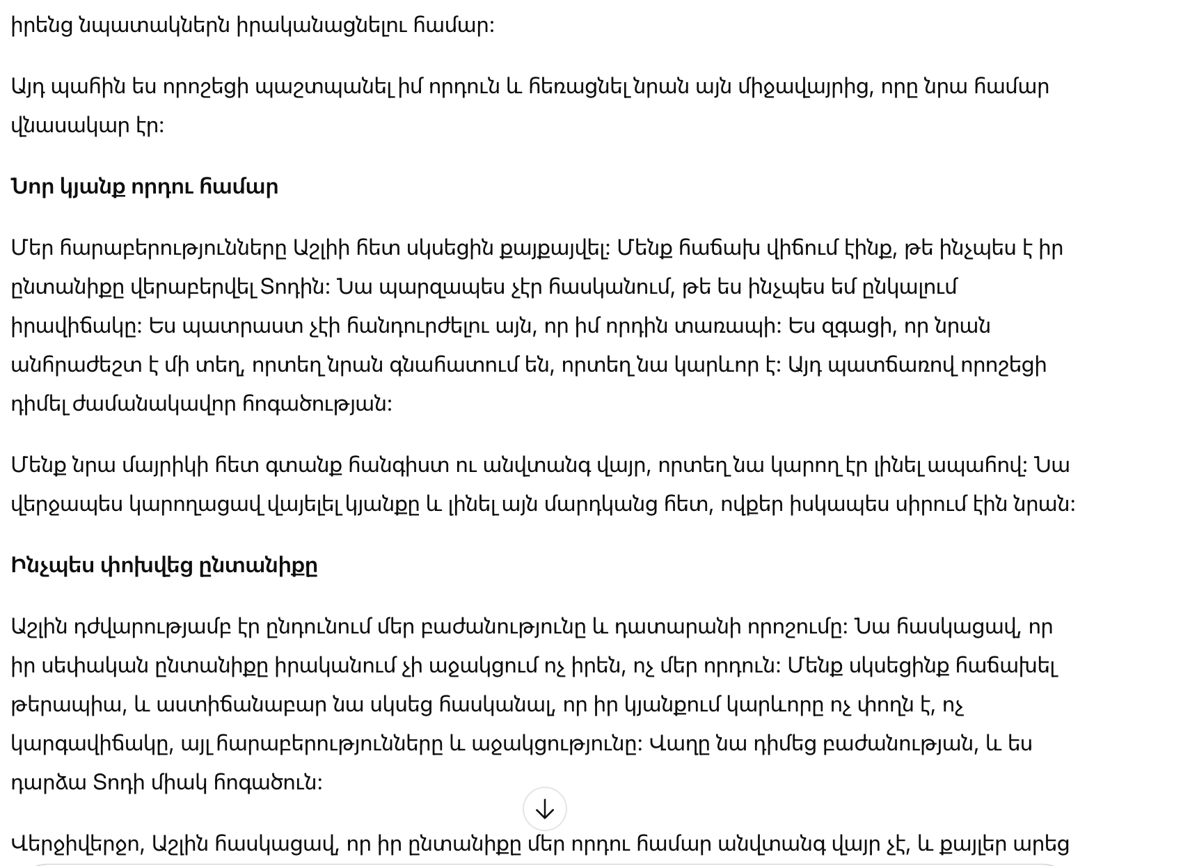 В итоге, в конце концов, Ашли пришла к осознанию того, что её семья – это не место для нашего сына, и она сделала шаги к восстановлению нашего доверия. Мы начали понемногу строить отношения заново.