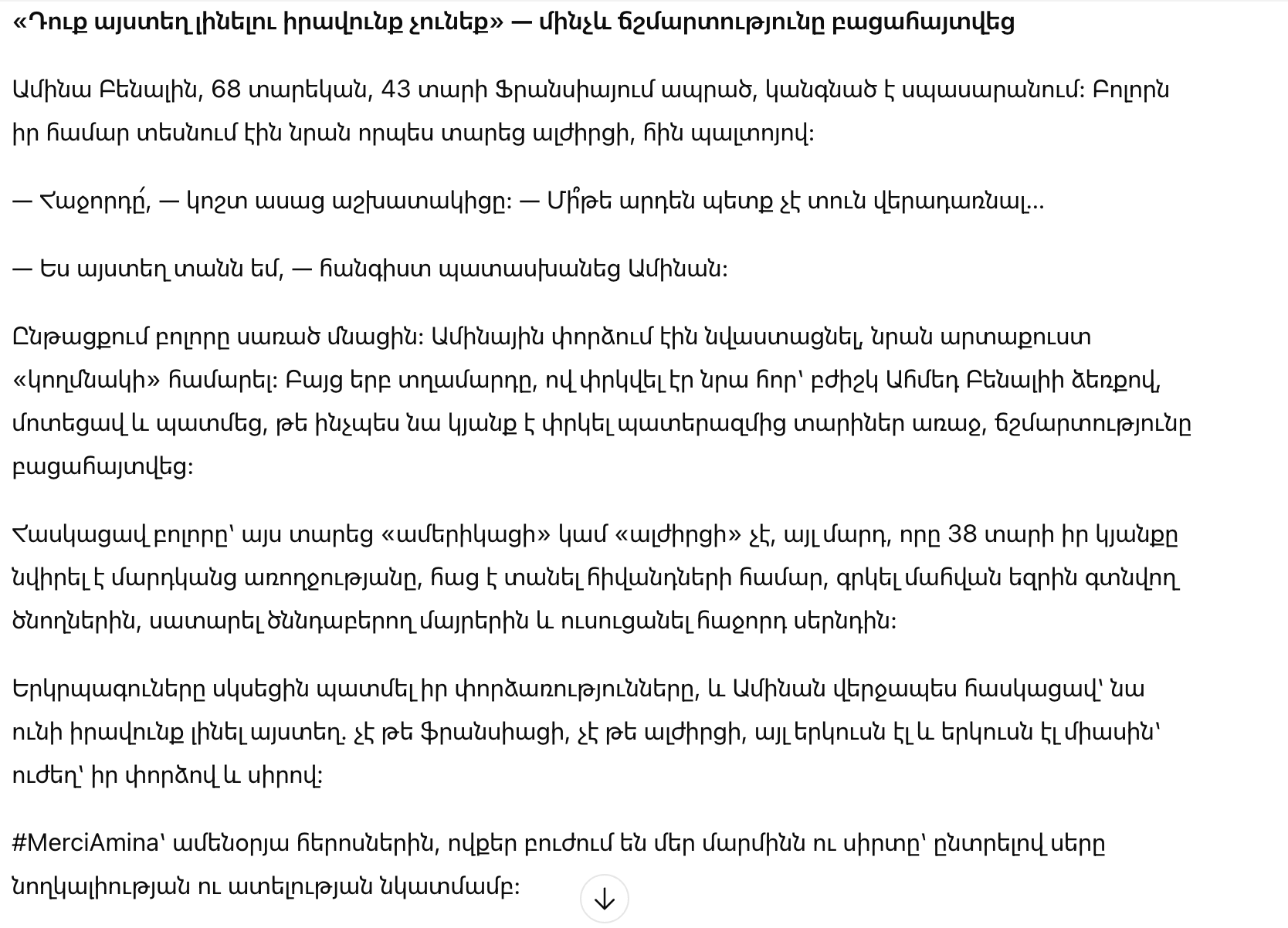 Не зная, кто она такая, никому не известная алжирка стала жертвой унижения в сердце Парижа. “Ты не имеешь права находиться здесь”, – кричали ей. Но когда правда раскрылась, выражения шока и раскаяния появилось на их лицах. Эта женщина с седыми волосами и усталым взглядом ждала в очереди, как и каждое утро.