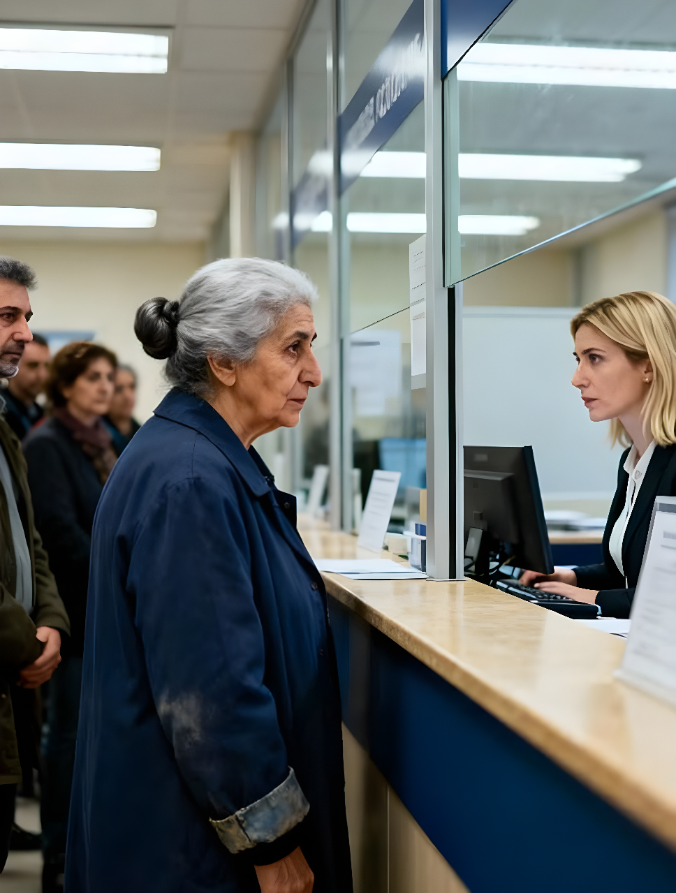 «Следующая!» – выкрикнул сотрудник за своим столом. Голос был резким, почти враждебным. Амина медленно направилась вперёд, притиснув документы к груди. На ней был старый тёмно-синий плащ, изношенный на локтях, но по-прежнему чистый. Её волосы были аккуратно собраны в простой пучок.