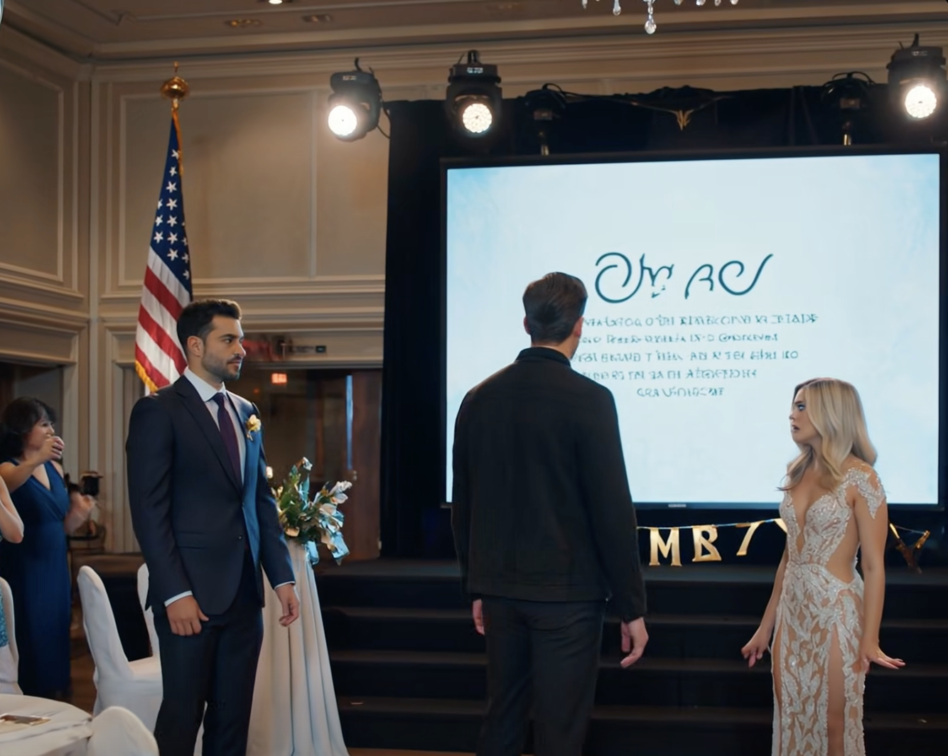 Это не исходило со сцены. Это исходило откуда-то слегка справа, достаточно близко, чтобы звучать тихо и с навыком, чтобы притвориться, что это частное шептание. Голос невесты, сладкий, как будто она все вечер пила шампанское, и резкий, как будто она его очень ждала.