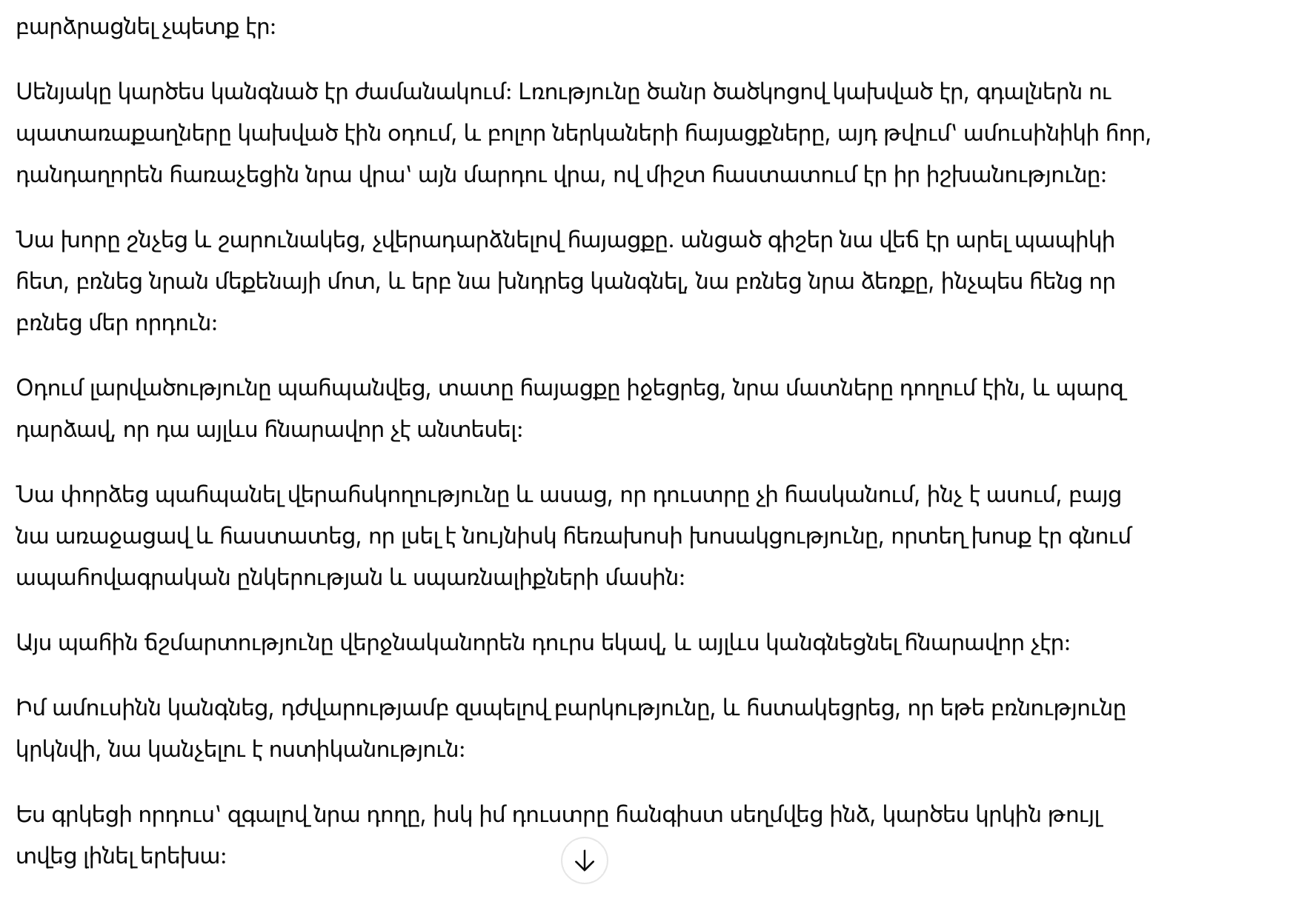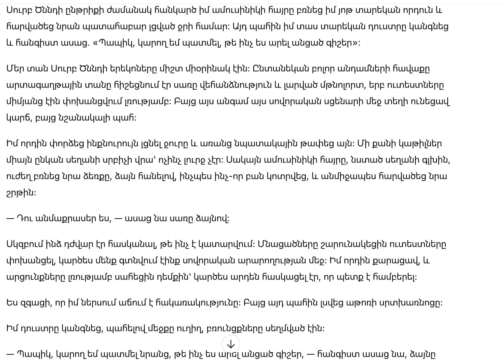 Сначала мне было трудно понять, что происходит. Остальные продолжали передавать блюда, как будто мы находились в привычном ритуале. Мой сын замер, и слезы покатились по его лицу в молчании, словно он уже усвоил, что нужно терпеть.