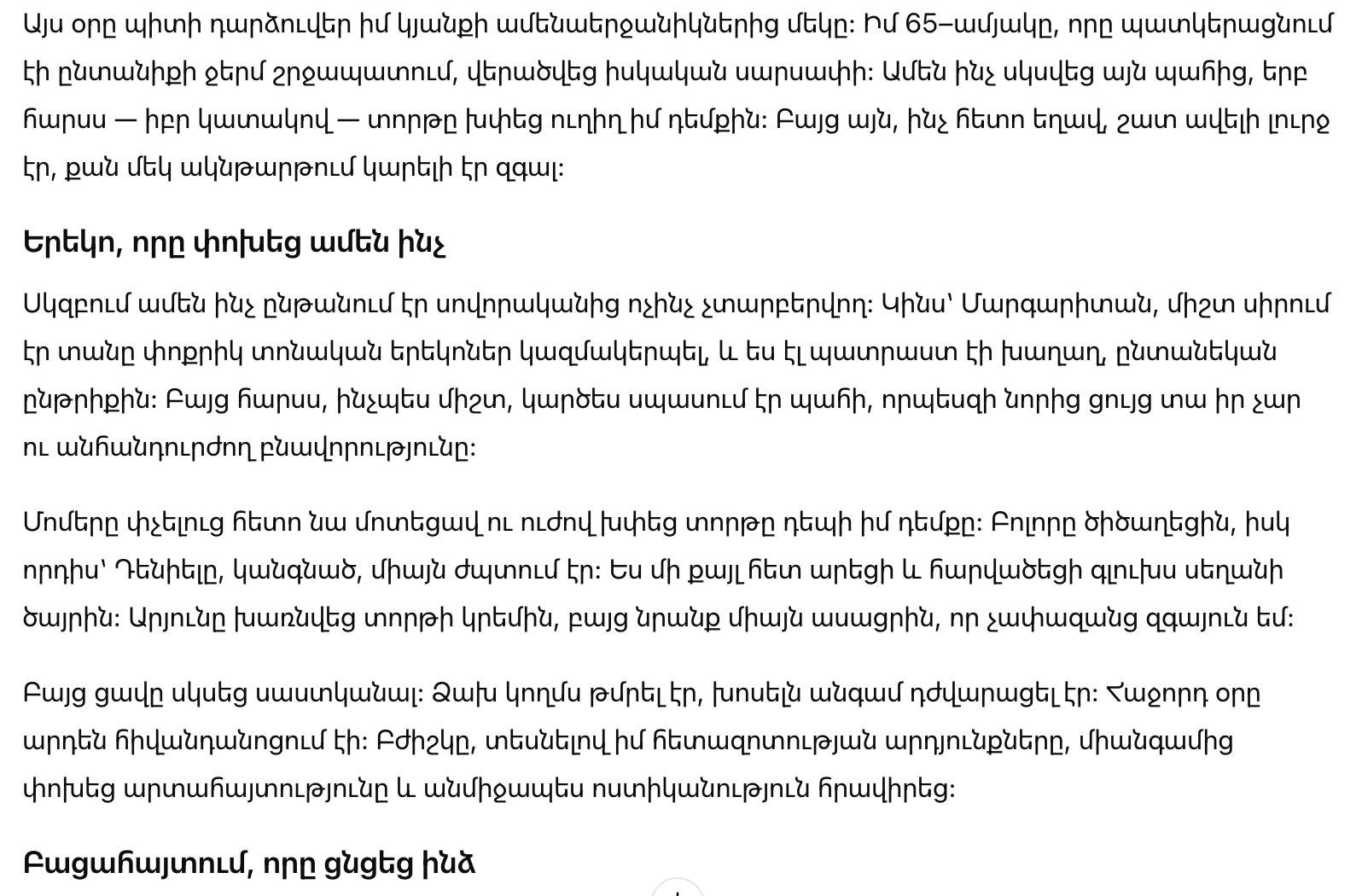 В тот момент я понял, что то, что началось как маленькая шутка, имело гораздо более серьезные последствия. Оказавшись в больнице, я услышал от врача, что у меня не просто травма от падения, а серьезные повреждения, вызванные не единичным случайным инцидентом, а регулярным насилием. В его глазах я прочитал то, что никогда не ожидал увидеть: не заботу, а ужас.