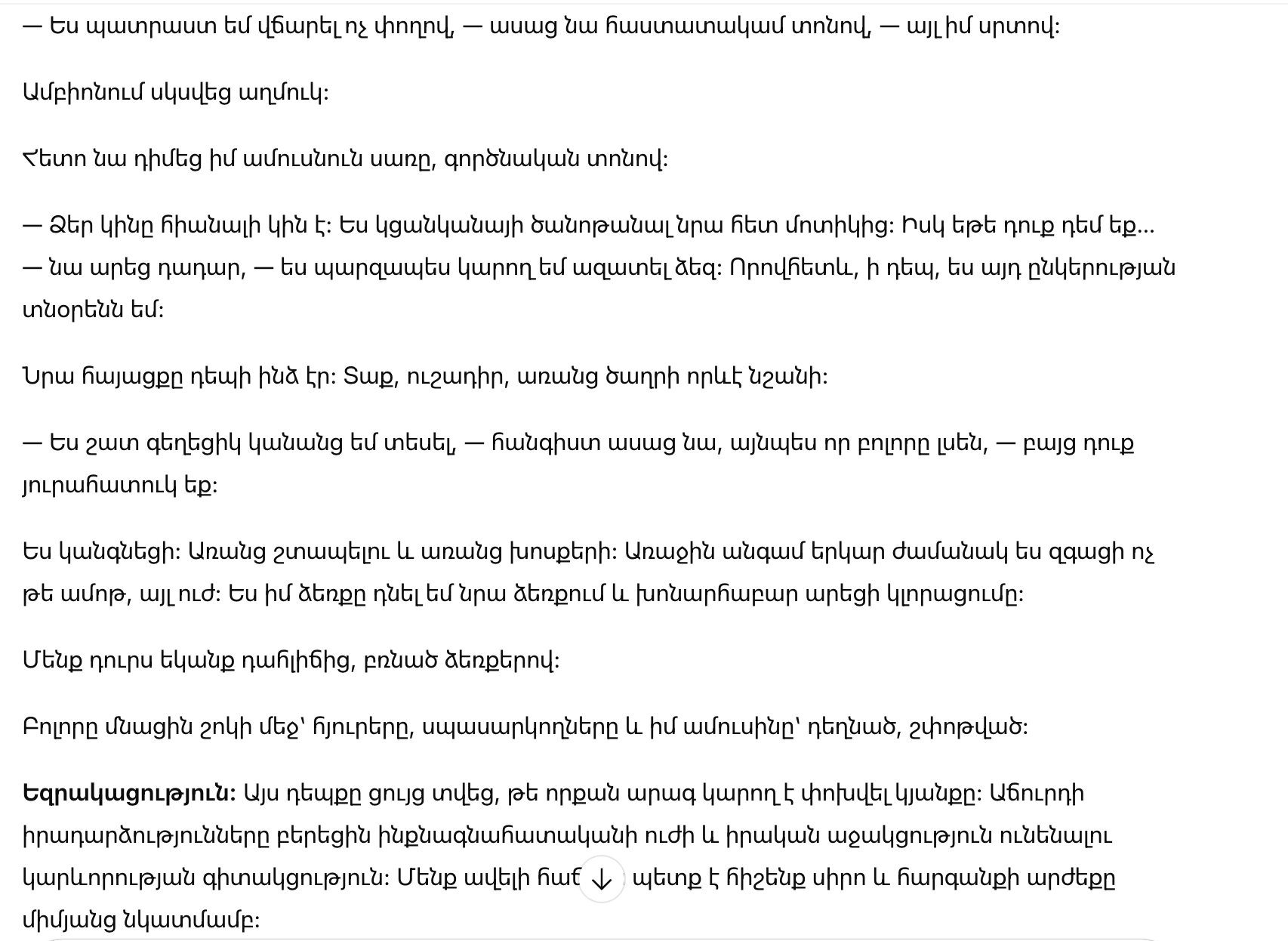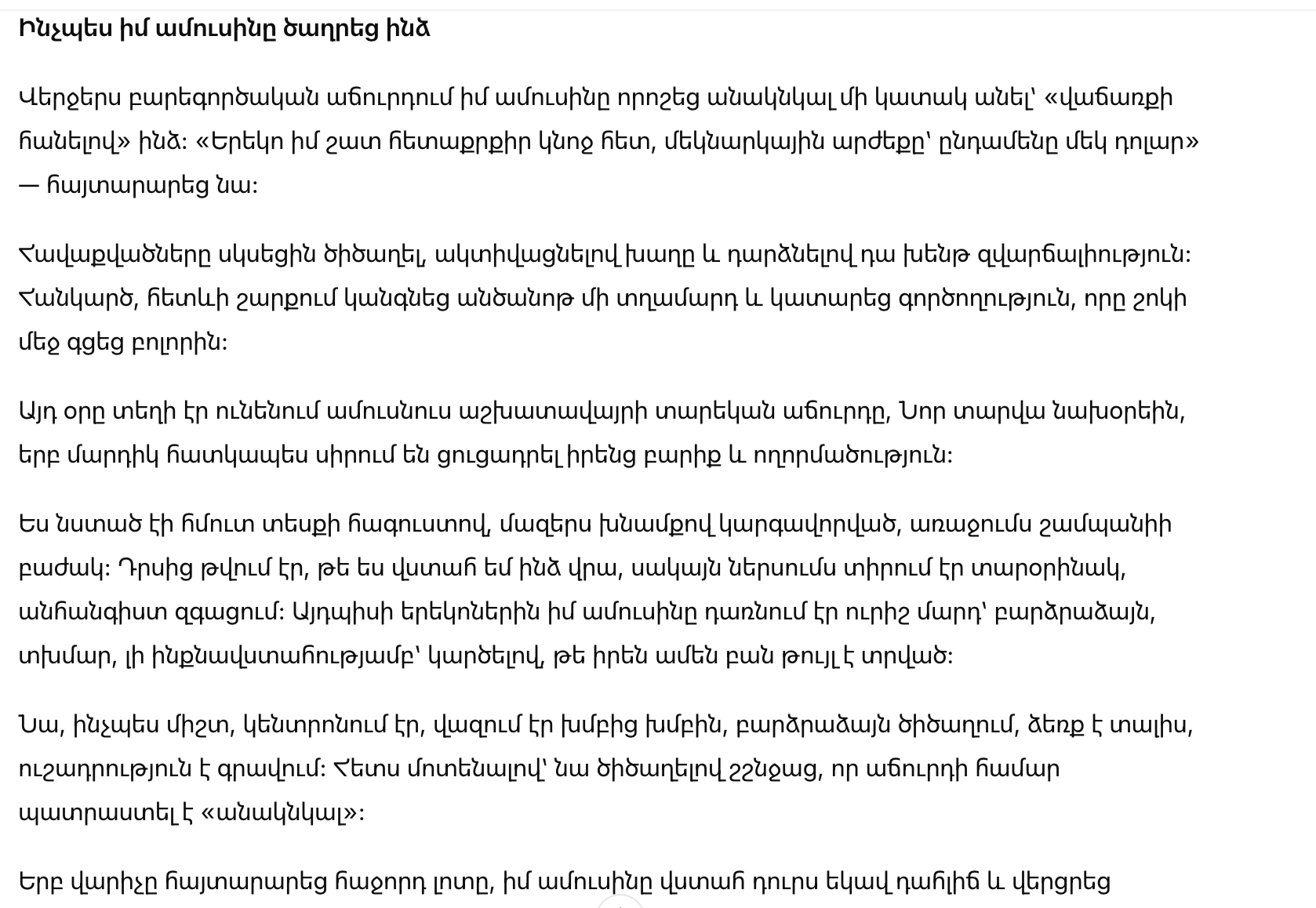 Вывод: Этот инцидент показал, как быстро может измениться жизнь. События на аукционе принесли осознание силы самоуважения и важности настоящей поддержки. Мы чаще должны помнить о ценности любви и уважения в отношении друг к другу.