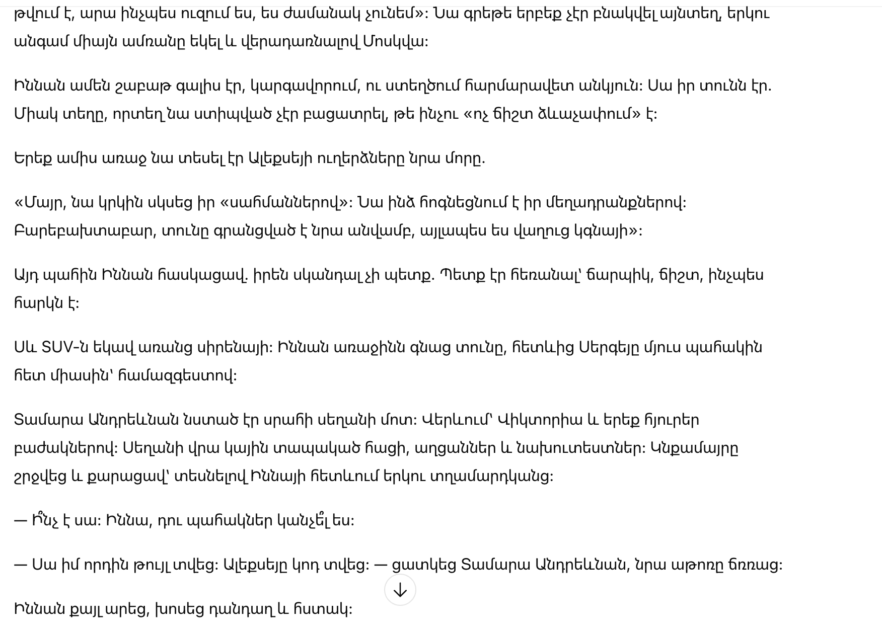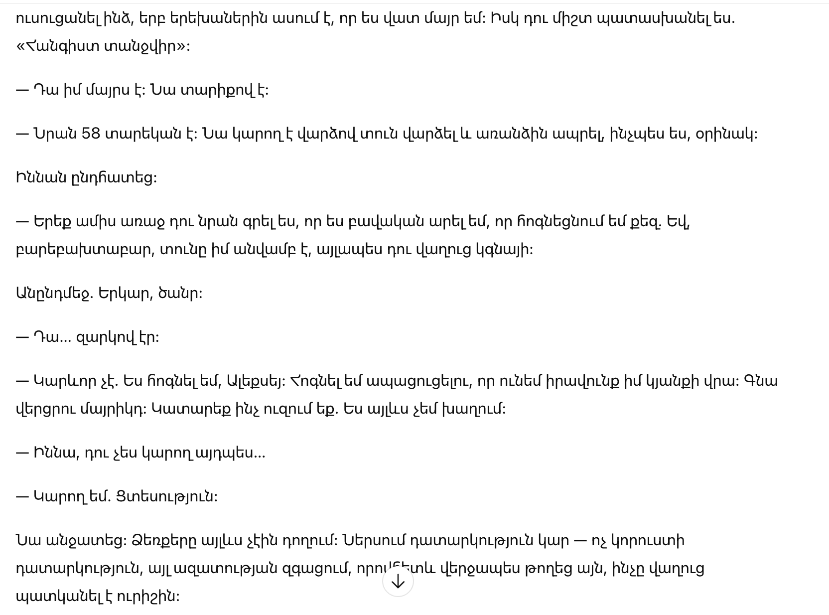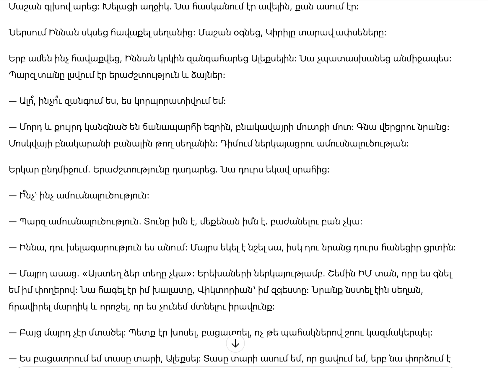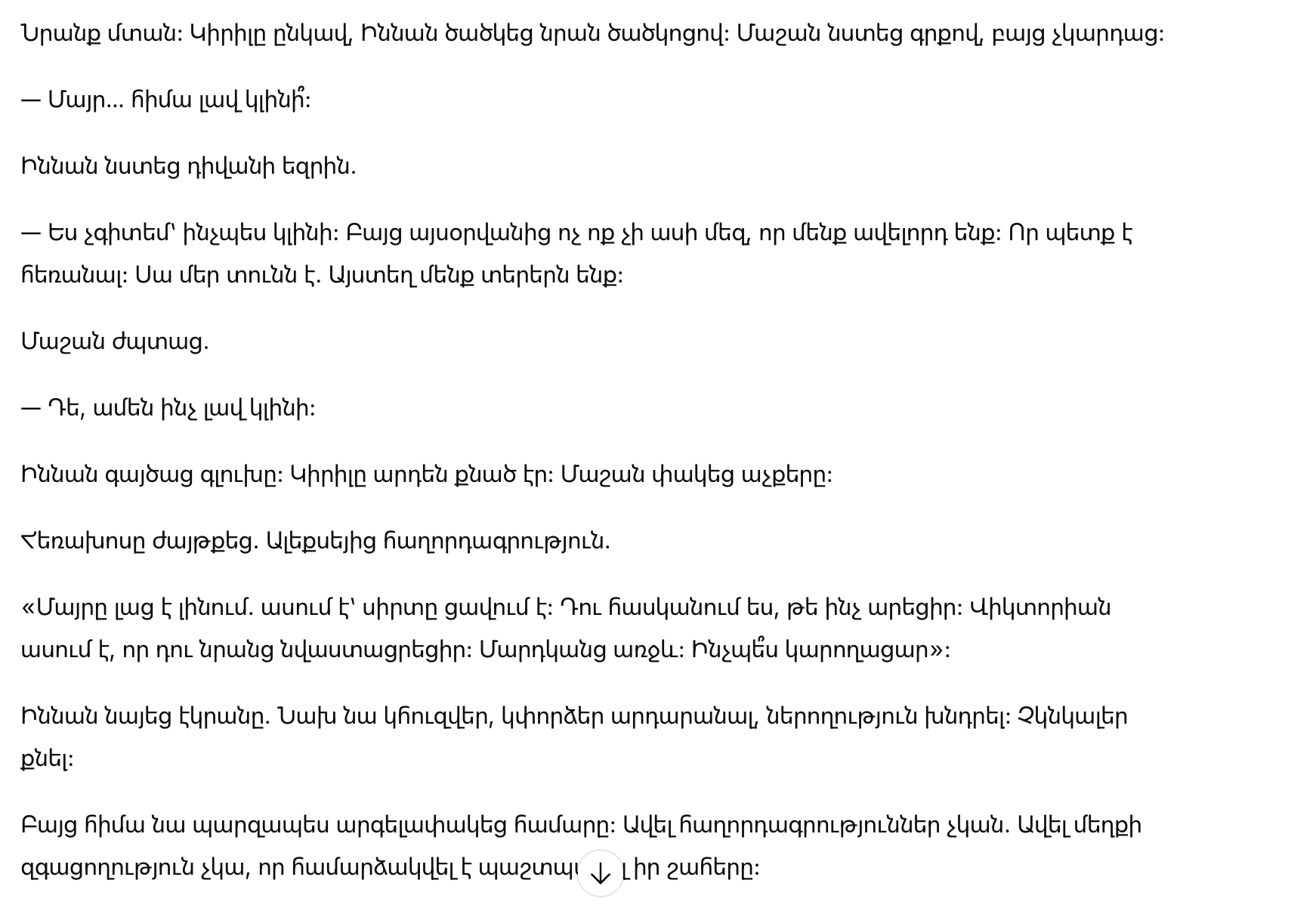 «Мама плачет. Говорит, у неё болит сердце. Ты понимаешь, что ты натворила? Виктория говорит, что ты их унизила. На глазах у людей. Как ты могла?»