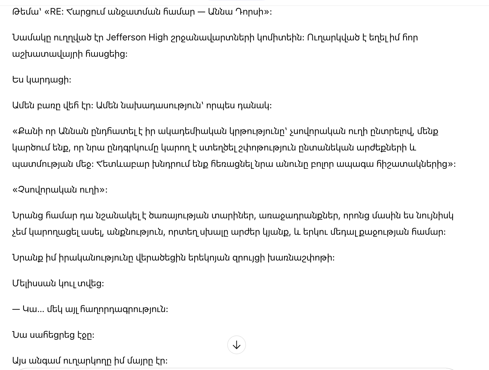 — Я только что получила утечку из совета Jefferson High… Email от Дорси, датированный 2010, о том, чтобы убрать имя Анны Дорси из доски выпускников, чтобы… “избежать путаницы касательно наследия семьи”.