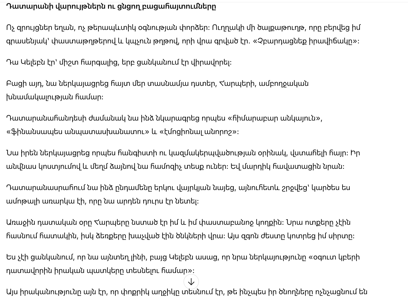 В первый день слушания Харпер сидела рядом со мной и моим адвокатом. Её ноги не касались пола, а руки были скрещены на коленях. Этот настороженный жест разбил мое сердце.