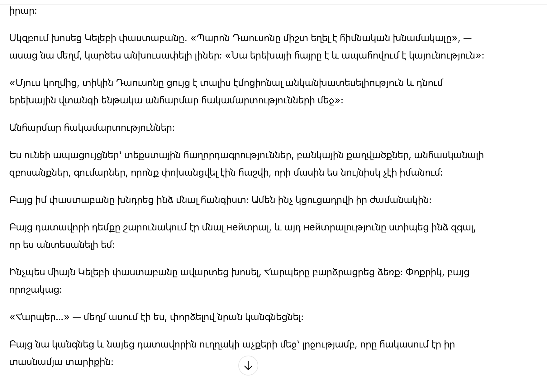 Сначала заговорил адвокат Калеба. «Господин Доусон всегда был основным опекуном», – произнесла она мягко, как если бы это было неизбежно. «Он отец ребенка и гарантирует стабильность.»