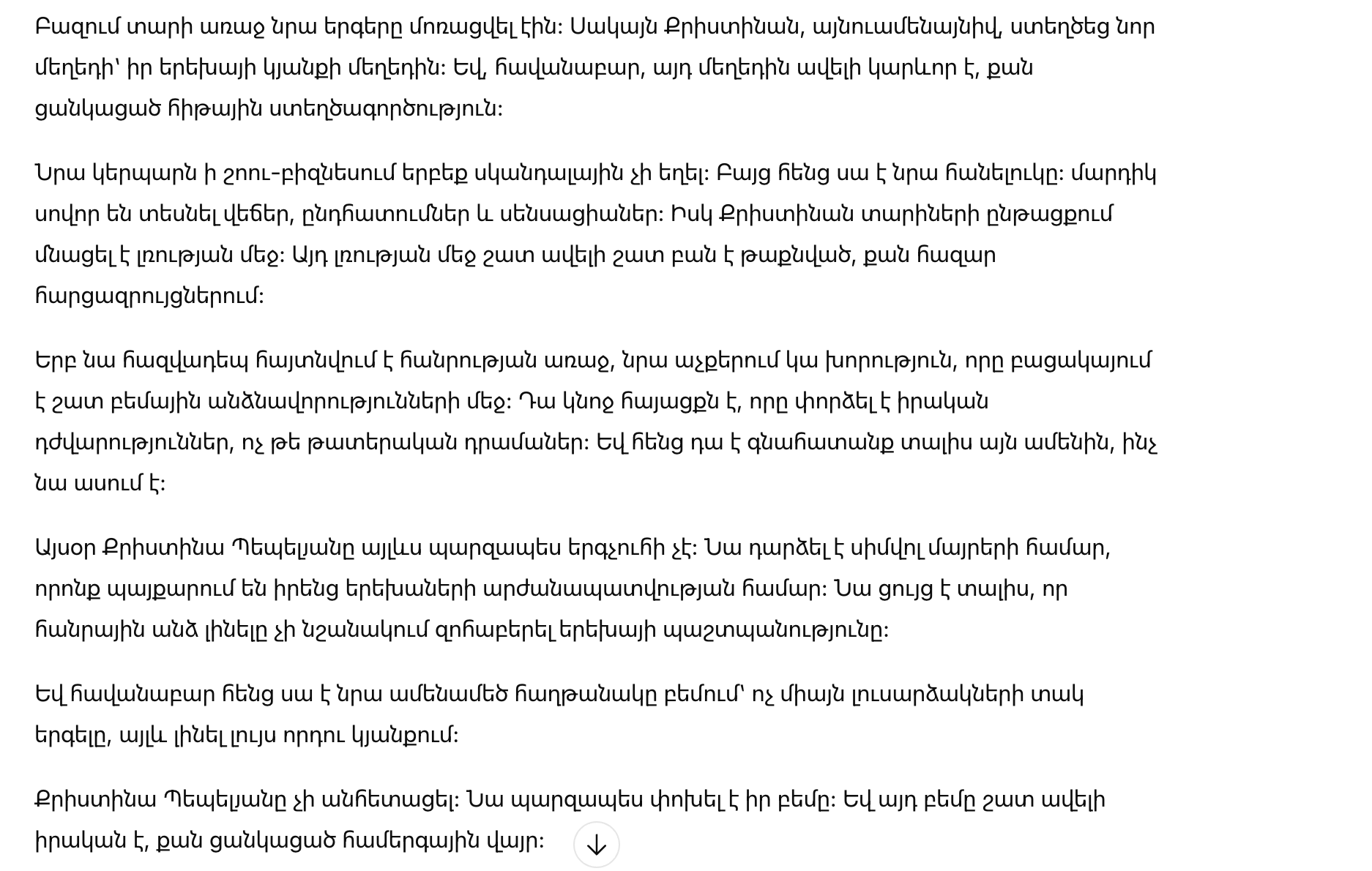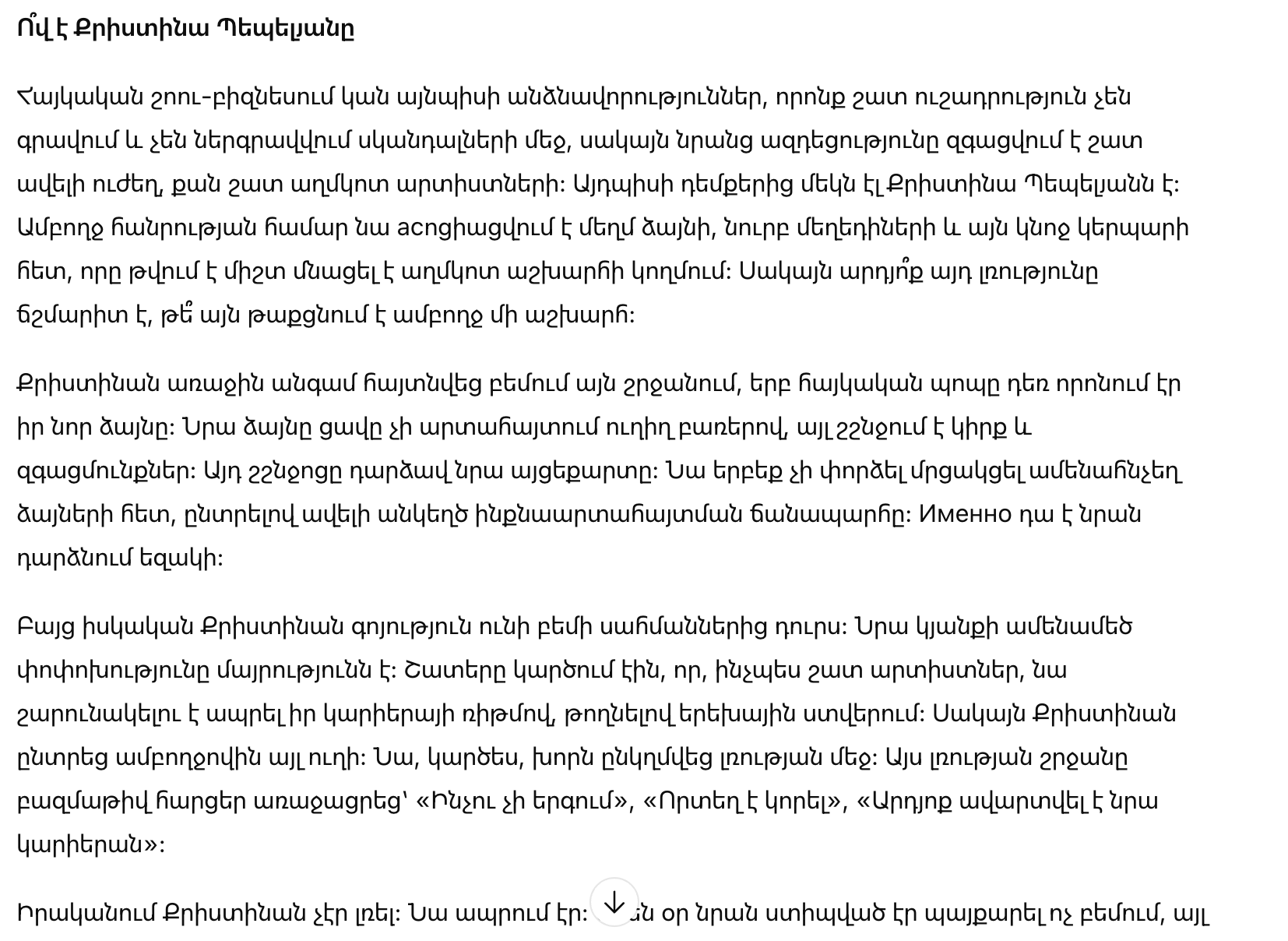 Кристина впервые вышла на сцену в период, когда армянский поп еще искал свое новое звучание. Ее голос не выражает боли прямыми словами, а шепчет острасть и чувства. Этот шепот стал её визитной карточкой. Она никогда не пыталась соревноваться с самыми громкими голосами, выбрав более искренний путь самовыражения. Именно это делает её уникальной.