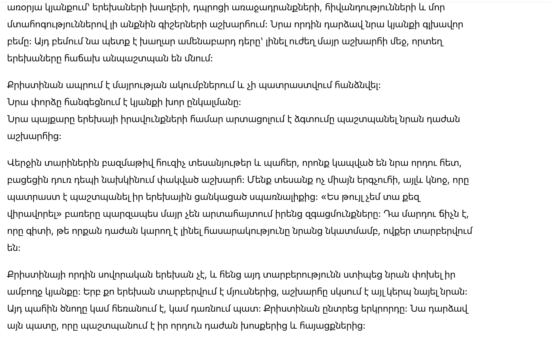 • Её бой за права ребенка отражает стремление защитить его от жестокого мира.