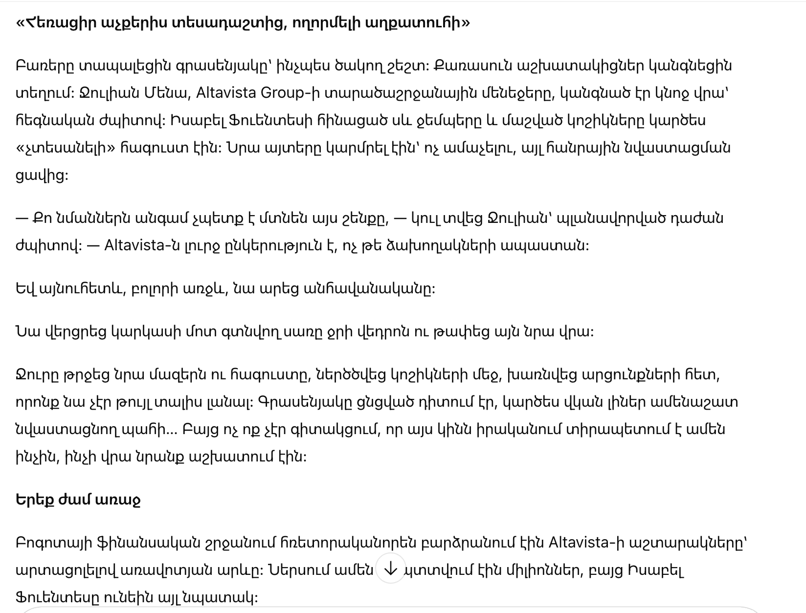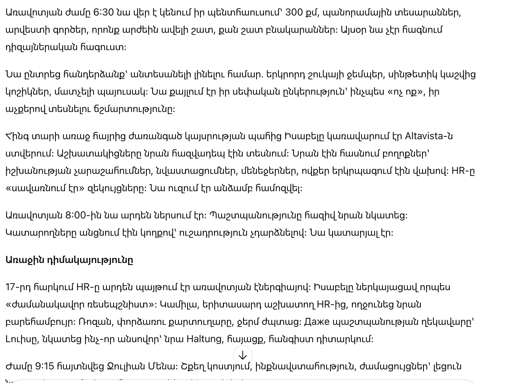 Она выбрала наряд, чтобы быть незаметной: пиджак из секонд-хенда, туфли из искусственной кожи, дешёвая сумка. Она шла в свою собственную компанию как никто, чтобы увидеть правду своими глазами.