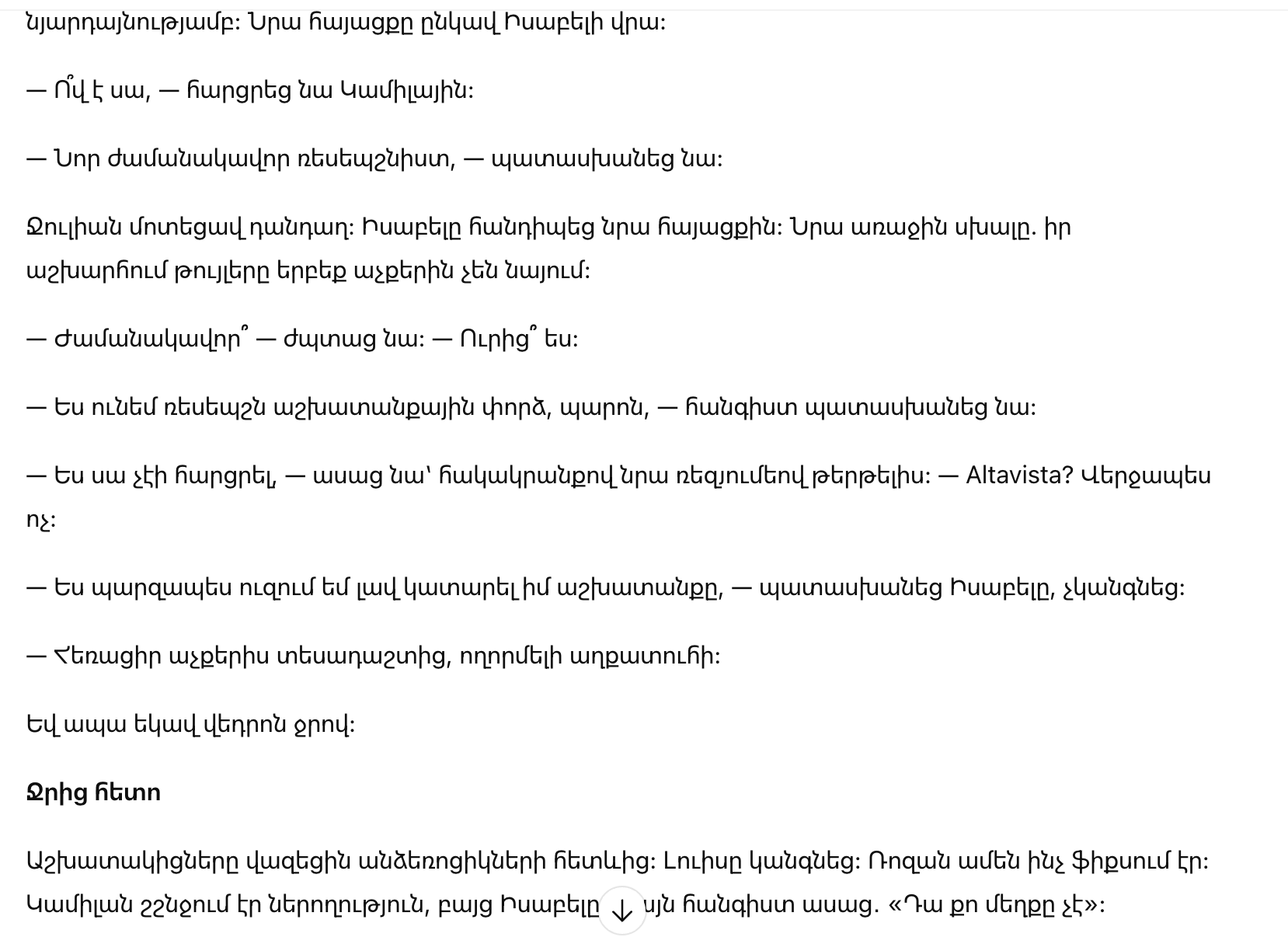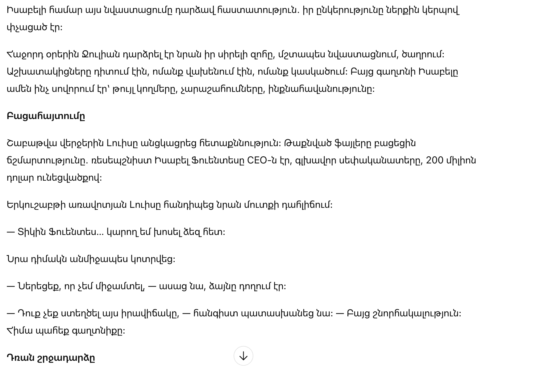 В последующие дни Хулиан сделал её своей любимой жертвой, постоянно унижал, издевался. Сотрудники наблюдали, кто-то боялся, кто-то сомневался. Но тайно Исабель узнавалa всё — слабости, злоупотребления, самодовольство.