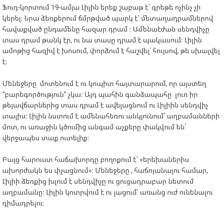 Но одна состоятельная посетительница начала возмущаться и потребовала, чтобы Лили пересела подальше. Менеджер, желая угодить, забрал у Лили сэндвич и демонстративно выбросил его. Лили не выдержала и расплакалась.