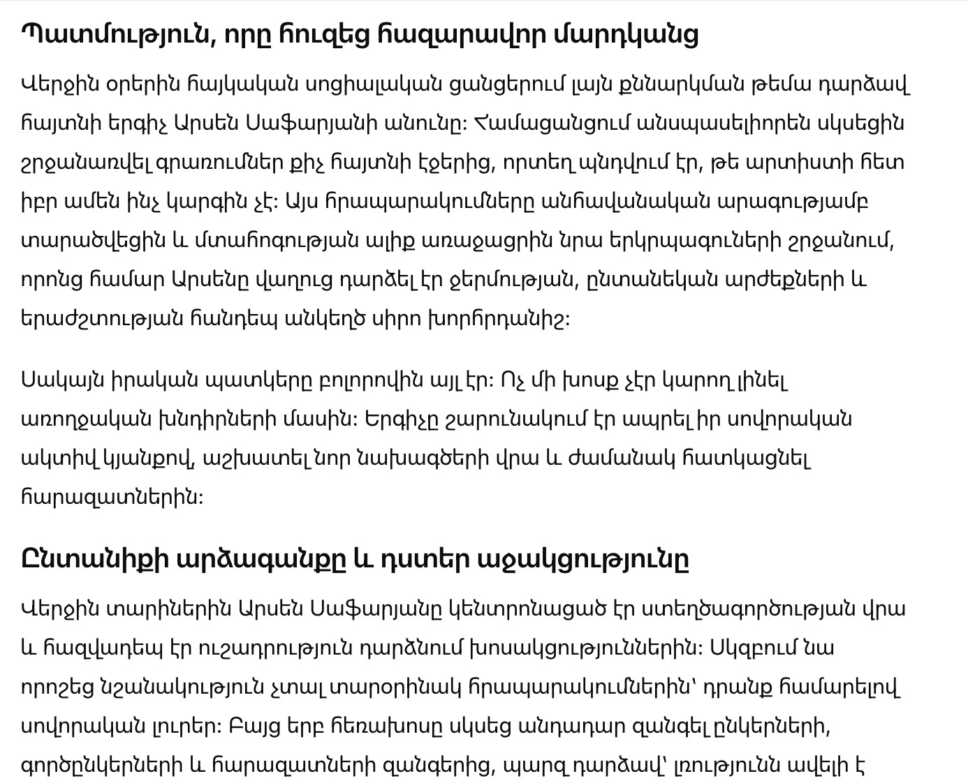 В последние дни армянские социальные сети активно обсуждали имя известного певца Арсена Сафаряна. На просторах интернета неожиданно появились публикации от малоизвестных страниц, где утверждалось, что с артистом якобы не всё в порядке. Эти сообщения разлетелись с невероятной скоростью и вызвали волну переживаний среди поклонников, для которых Арсен давно стал символом тепла, семейных ценностей и искренней любви к музыке.