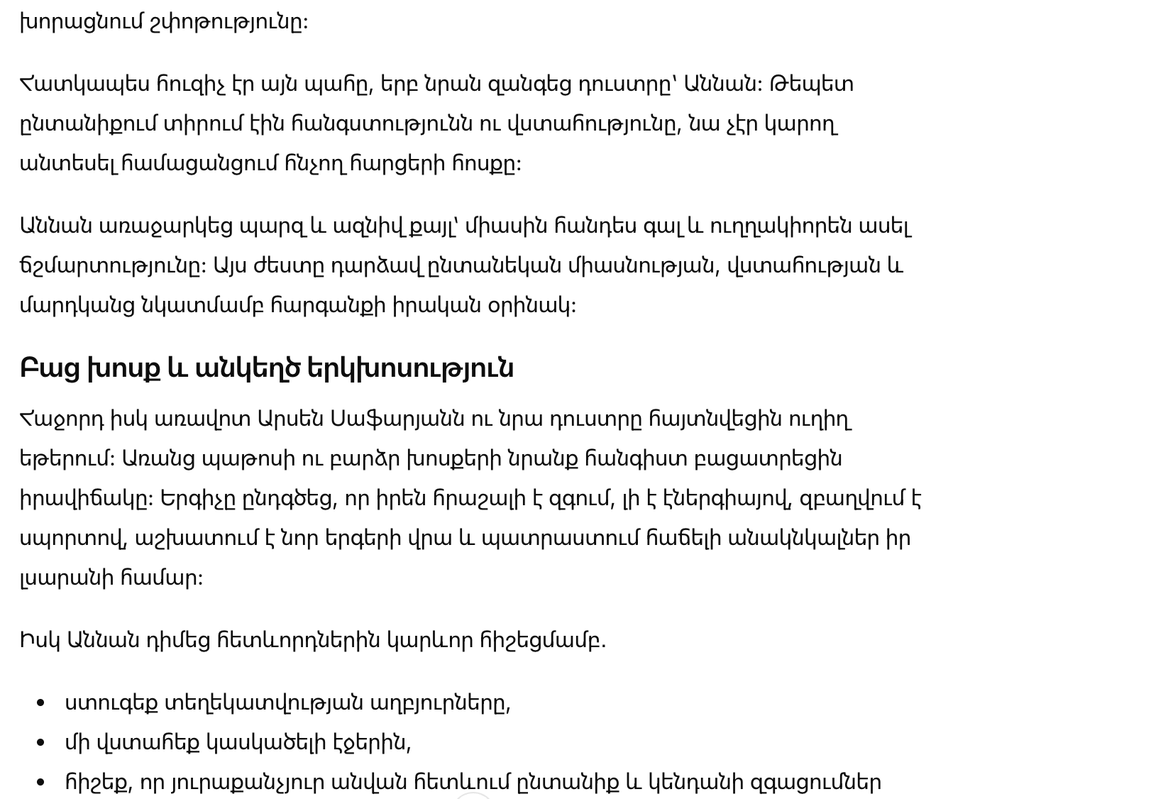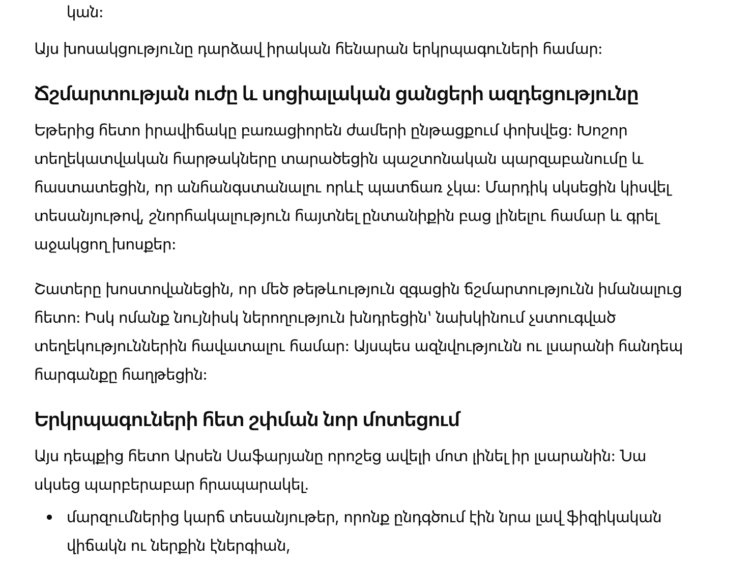 Уже на следующее утро Арсен Сафарян и его дочь появились в прямом эфире. Без пафоса и громких слов они спокойно объяснили ситуацию. Певец подчеркнул, что чувствует себя прекрасно, полон энергии, занимается спортом, работает над новыми песнями и готовит приятные сюрпризы для слушателей.