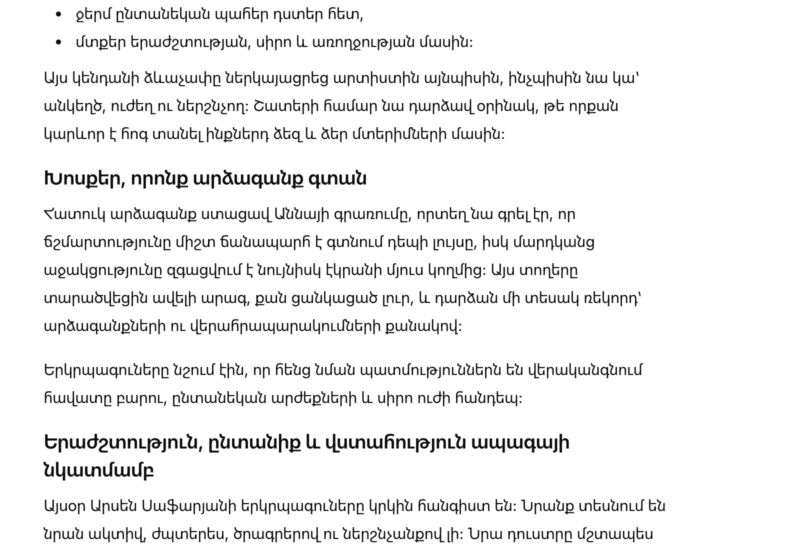 Эта история стала наглядным примером того, как любовь в семье, уважение к аудитории и забота о здоровье способны развеять любые сомнения. Арсен Сафарян и его дочь показали, что правда, сказанная вовремя, укрепляет связь между артистом и поклонниками, создаёт атмосферу доверия и вдохновляет на новые достижения.