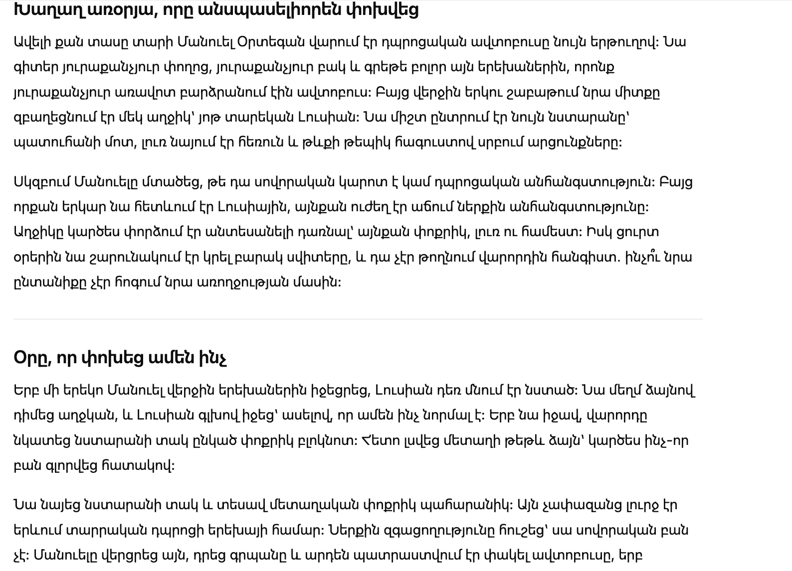 Больше десяти лет Мануэль Ортега водил школьный автобус одной и той же линии. Он знал каждую улицу, каждый двор и почти каждого ребенка, который поднимался по ступенькам утром. Но две недели подряд его мысли занимала одна девочка — семилетняя Лусия. Она всегда выбирала одно и то же место у окна, тихо смотрела вдаль и вытирала слезы рукавом своего старенького свитера.