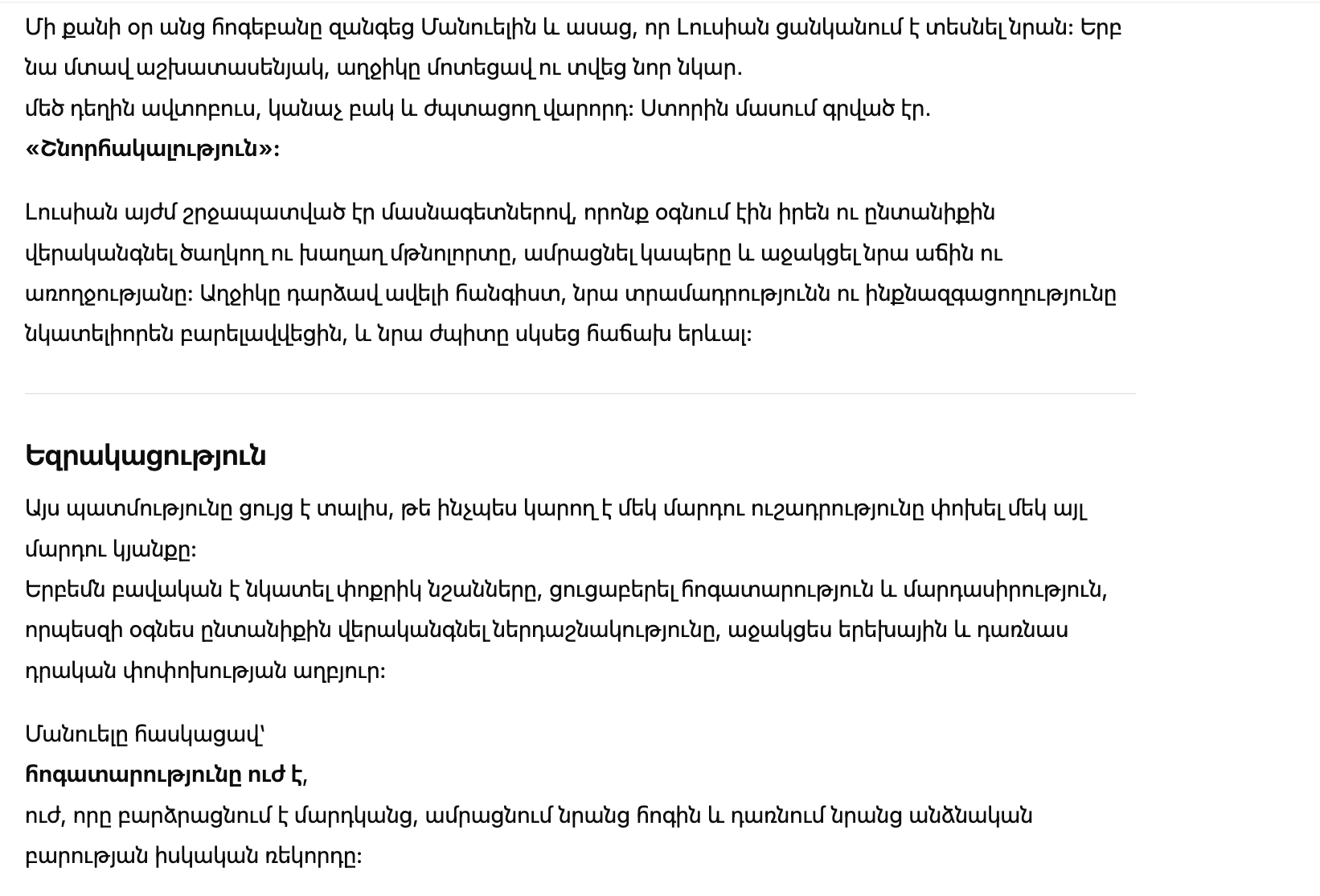 Через несколько дней психолог позвонила Мануэлю и сказала, что Лусия просит его прийти. Когда он вошёл в кабинет, девочка подошла и протянула ему новый рисунок: большой желтый автобус, зелёный двор и водитель с доброй улыбкой. Под рисунком было написано: