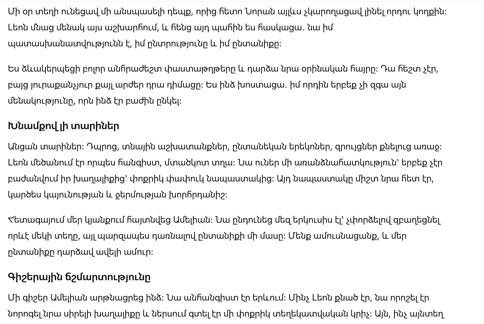 Однажды произошло внезапное событие, после которого Нора больше не смогла быть рядом с сыном. Лео остался один в этом мире, и в тот момент я понял: он — моя ответственность, мой выбор и моя семья.