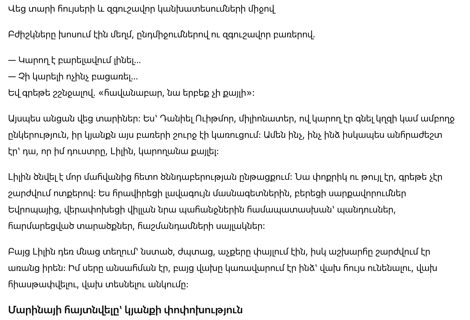 Так прошло шесть лет. Я, Даниэль Уитмор, миллионер, который мог купить остров или целую компанию, строил свою жизнь вокруг этих слов. Всё, что мне действительно было нужно — чтобы моя дочь Лили смогла ходить.