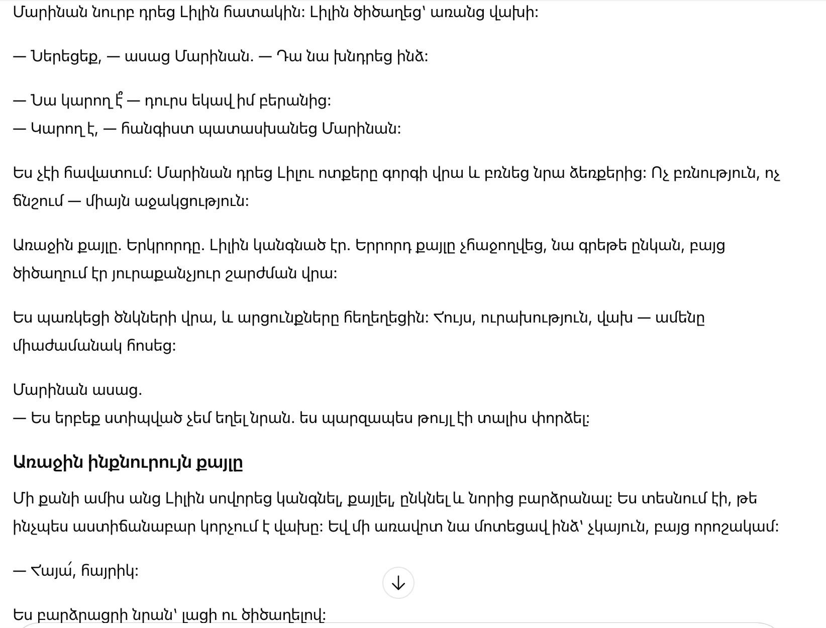 Я не мог поверить. Марина положила Лили ножки на ковёр и взяла её за руки. Без насилия, без давления — лишь поддержка.