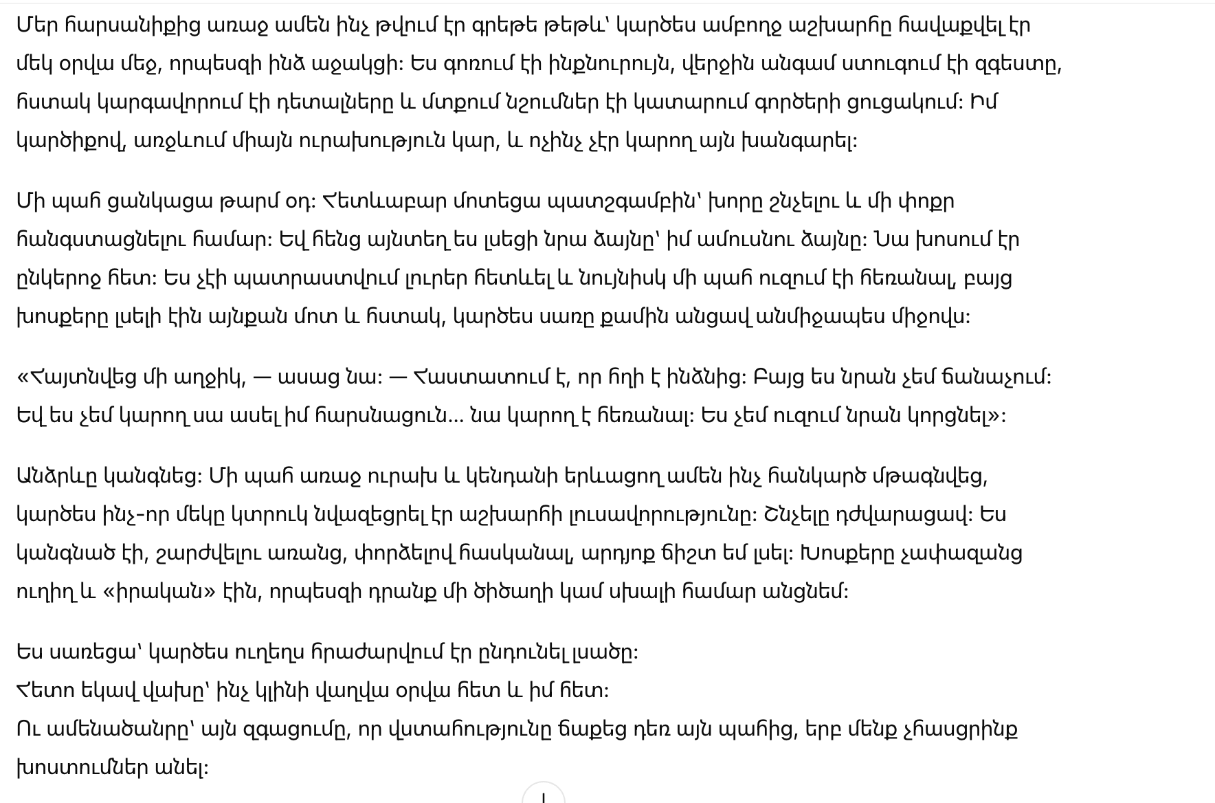Я не слышала всего разговора — и, возможно, это было даже к лучшему. Но хватило и этих фраз, чтобы внутри поднялась буря вопросов. Кто эта девушка? Почему он говорит, что «не знает» её, но при этом боится признаться мне? И главное — если он так легко выбирает молчание на пороге нашей семьи, что будет дальше?
