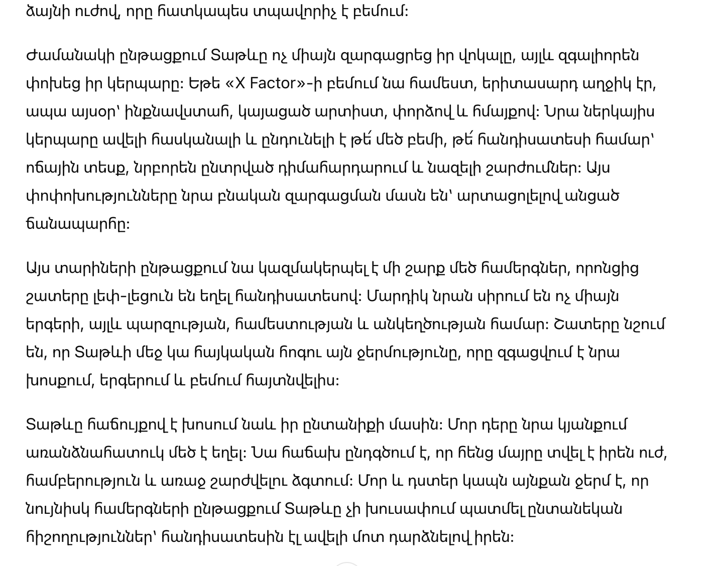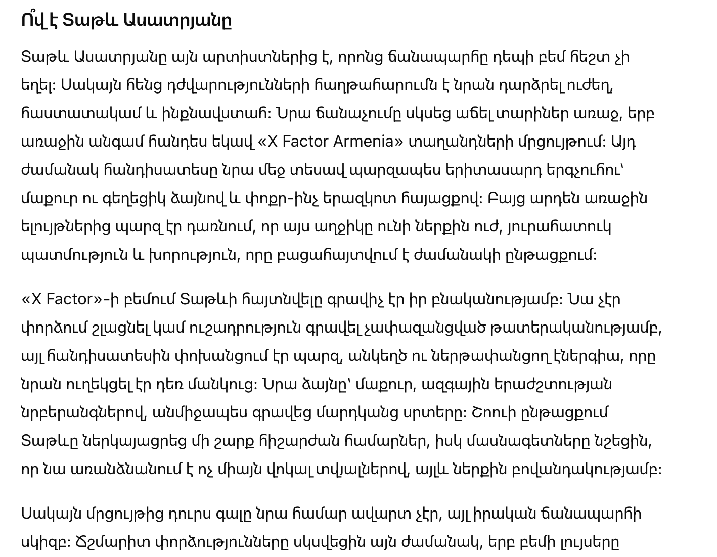Татев Асатрян — одна из тех артисток, чей путь на сцену оказался непростым. Тем не менее, именно преодоление трудностей сделало её сильной, настойчивой и уверенной в себе. Её популярность начала расти много лет назад, когда она впервые появилась на сцене в рамках конкурса талантов «X Factor Armenia». Тогда зрители увидели в ней просто молодую певицу с красивым, чистым голосом и немного мечтательным взглядом. Однако уже с первых выступлений становилось ясно, что у этой девушки есть внутренняя сила, уникальная история и особая глубина, раскрывающаяся со временем.