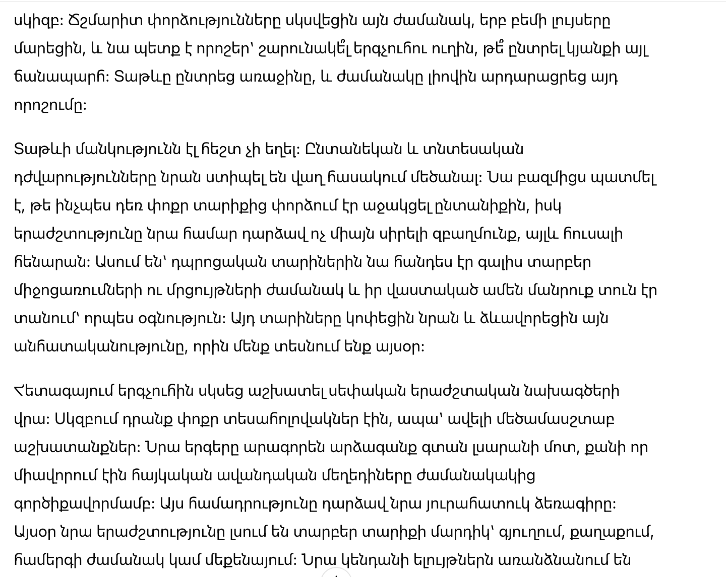 За эти годы Татев Асатрян стала не только певицей, но и примером для молодежи. Она показала, что невзирая на сложности жизни, можно достичь целей, если не сдаваться. Её история подлинная, искренняя и близка многим людям, которым тоже приходилось преодолевать житейские трудности.