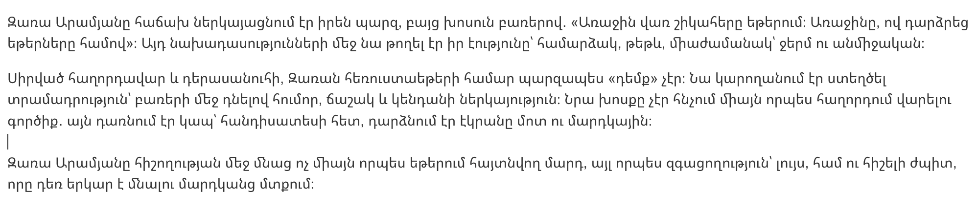 Зара Арамян осталась в памяти не только как человек, появившийся в эфире, но и как чувство: лёгкость, вкус и незабываемая улыбка, которая надолго останется в памяти людей.