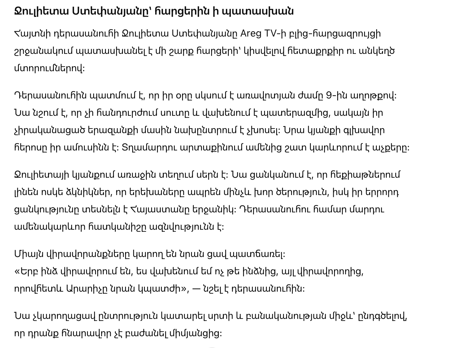 Известная актриса Джульета Степанян дала ответы на вопросы в формате блица от Арег TV, поделившись интересными размышлениями.