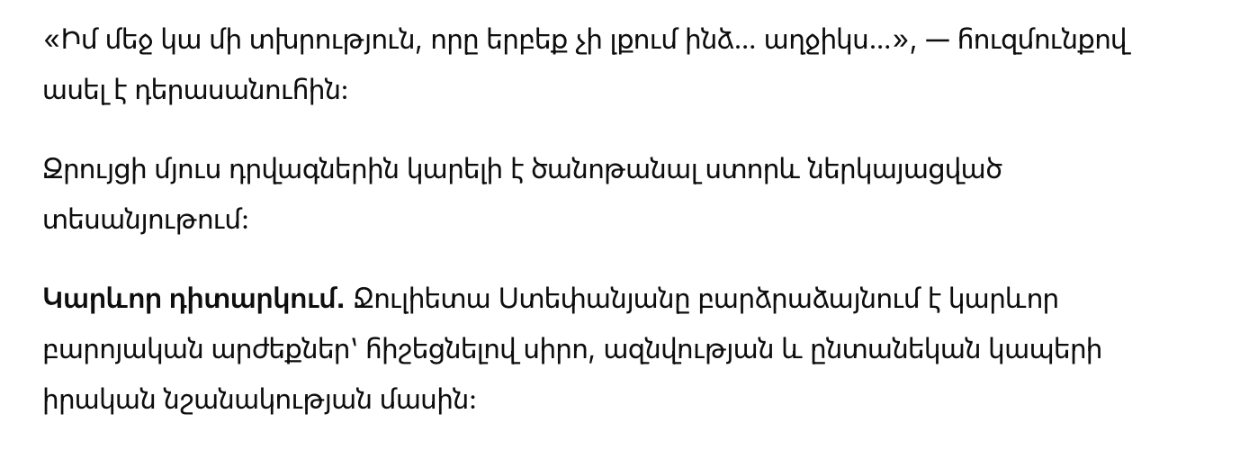Ключевое замечание: Джульета поднимает важные моральные аспекты, напоминая всем нам о ценности любви, честности и семейных уз.