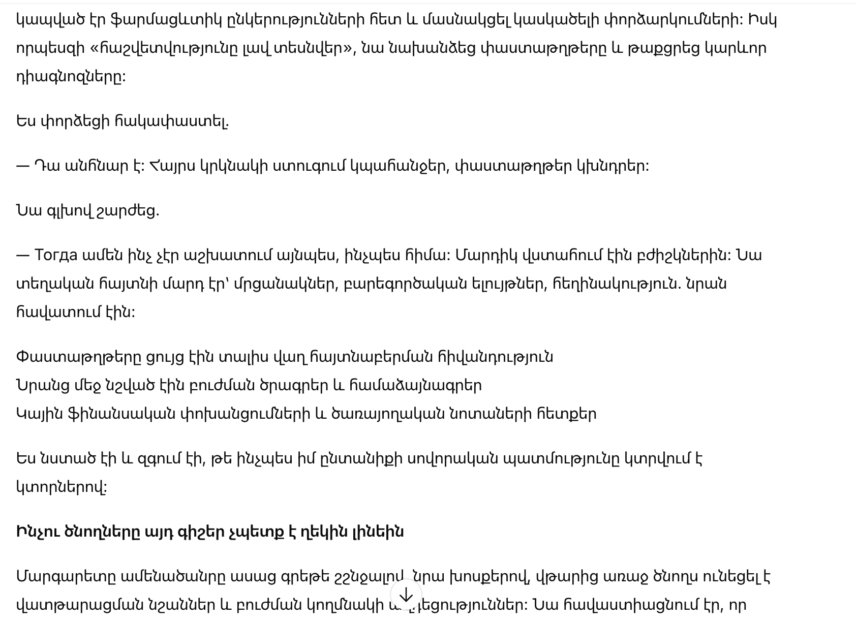 Я не спал. До рассвета я просматривал папки: таблицы, внутренние письма, списки людей, цифры. Чем больше я читал, тем яснее понимал: даже если часть окажется ошибкой или преувеличением, объем информации слишком велик, чтобы отмахнуться.