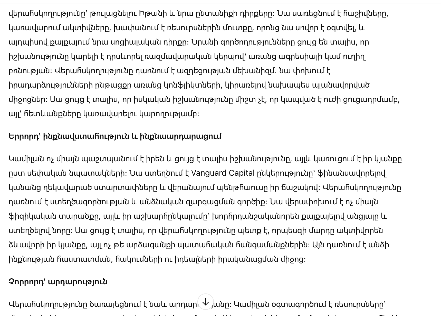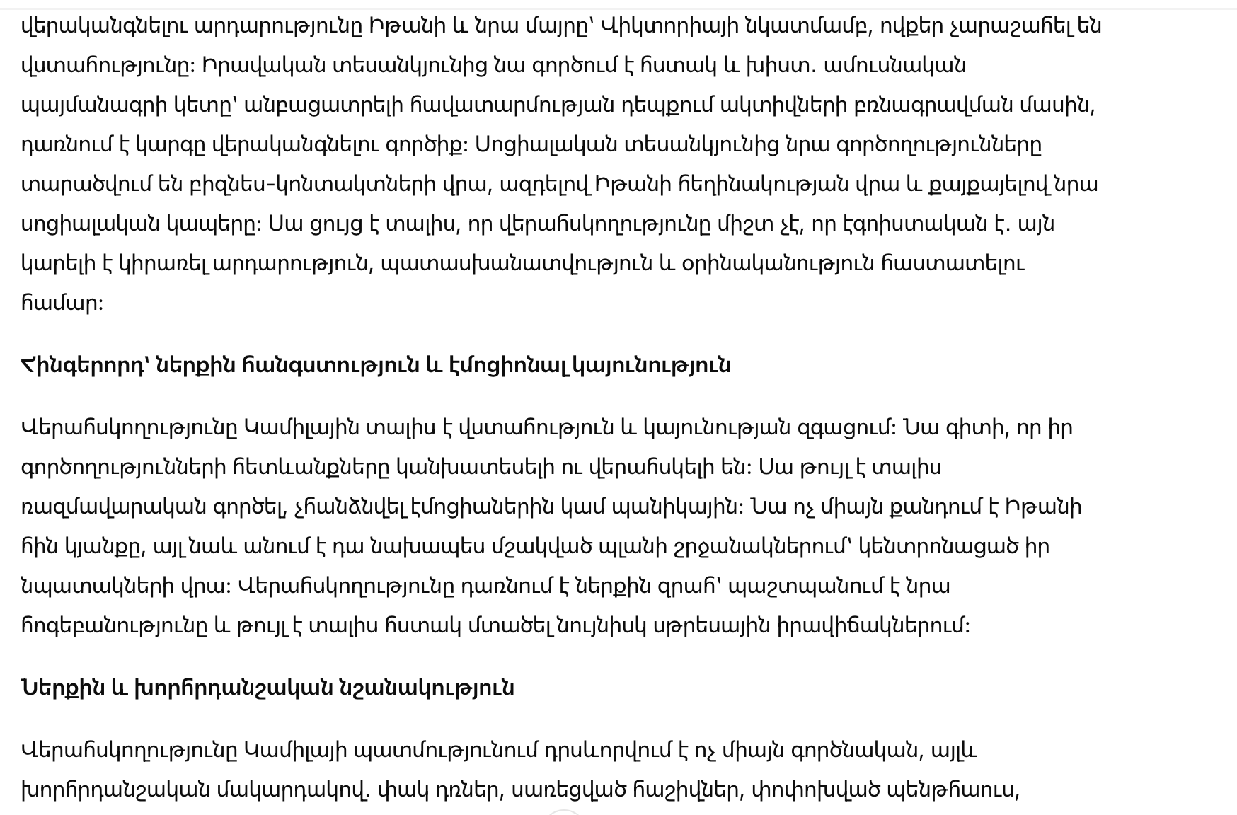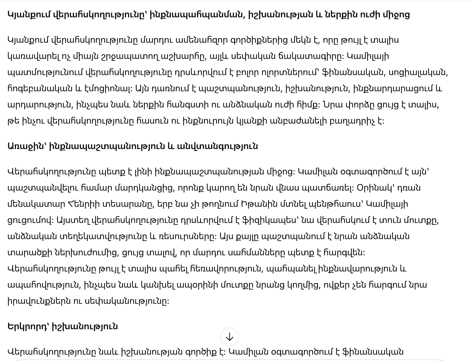 В конечном счёте, контроль — это не просто управление ситуацией или ресурсами; это акт утверждения собственной силы и самостоятельности. Камилла использует контроль, чтобы перерасти прошлое, построить империю и стать человеком, которым она всегда должна была быть. Она превращает разрушение в строительство, обман в стратегию, а боль в личное развитие. Контроль помогает ей не только выжить, но и процветать, устанавливая ясные границы, управляя последствиями и строя жизнь по своим правилам.