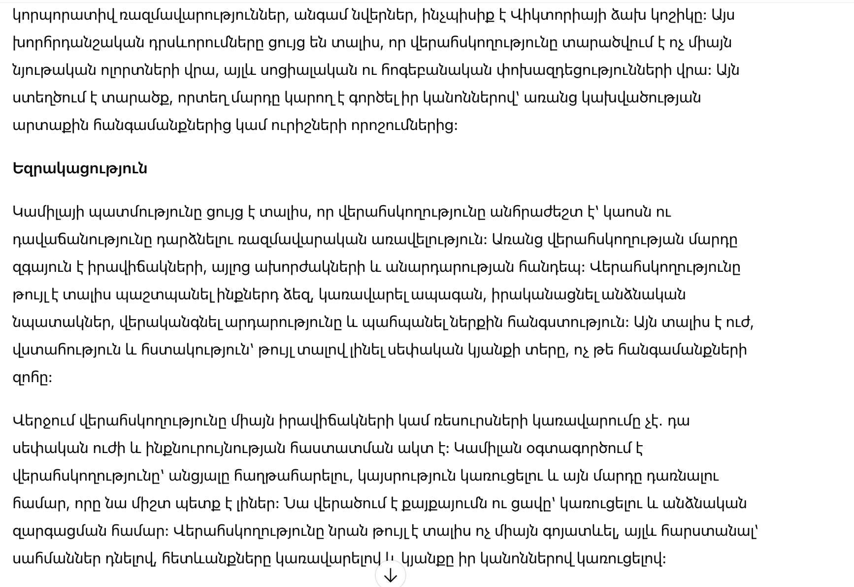 История Камиллы учит тому, что контроль в жизни нужен для того, чтобы превратить хаос и предательство в стратегическое преимущество. Без контроля человек остаётся уязвимым перед обстоятельствами, чужими амбициями и несправедливостью. Контроль позволяет не только защищать себя, но и управлять своим будущим, реализовывать личные цели, восстанавливать справедливость и сохранять внутреннее спокойствие. Он даёт возможность человеку формировать жизнь по своему образу, а не становиться пассивным наблюдателем.