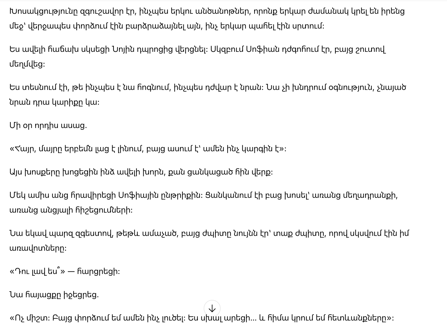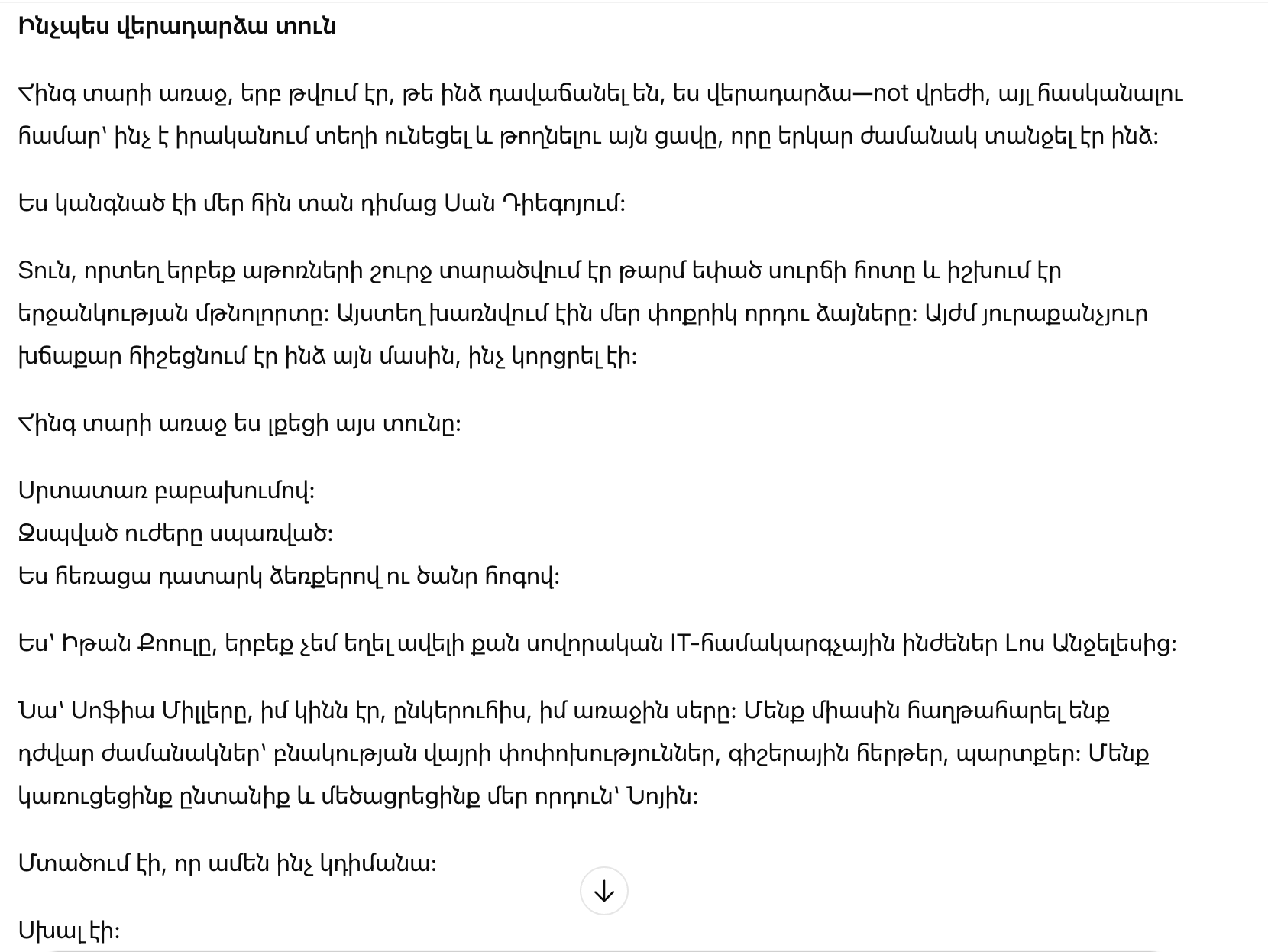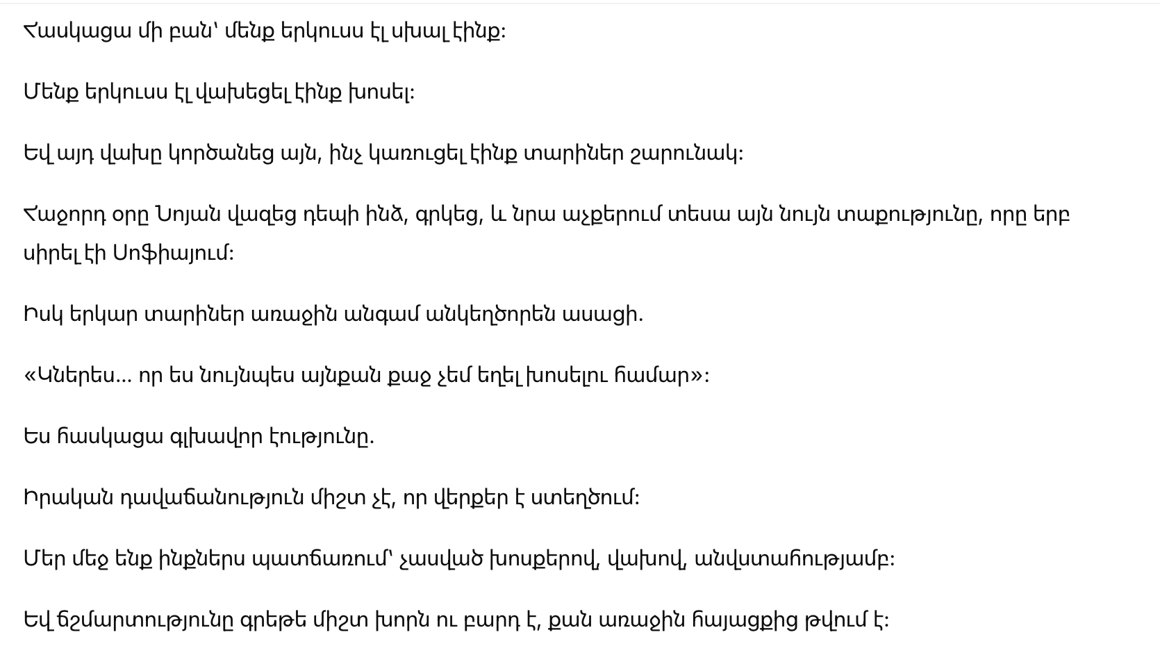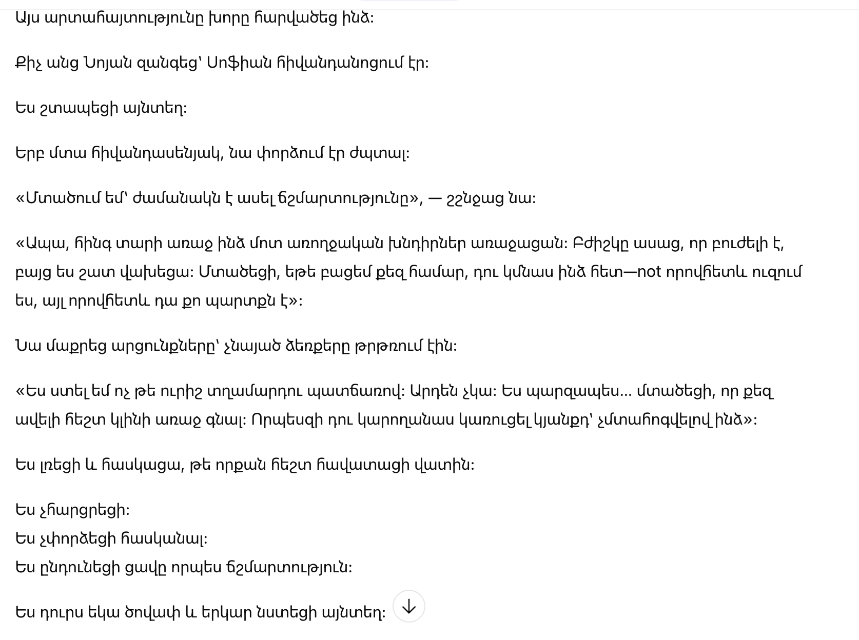 «Тогда, пять лет назад, у меня возникли проблемы со здоровьем. Врач сказал, что это лечится, но я сильно испугалась. Я думала, что если раскрою это, ты останешься со мной — не потому что хочешь, а потому что это твой долг».
