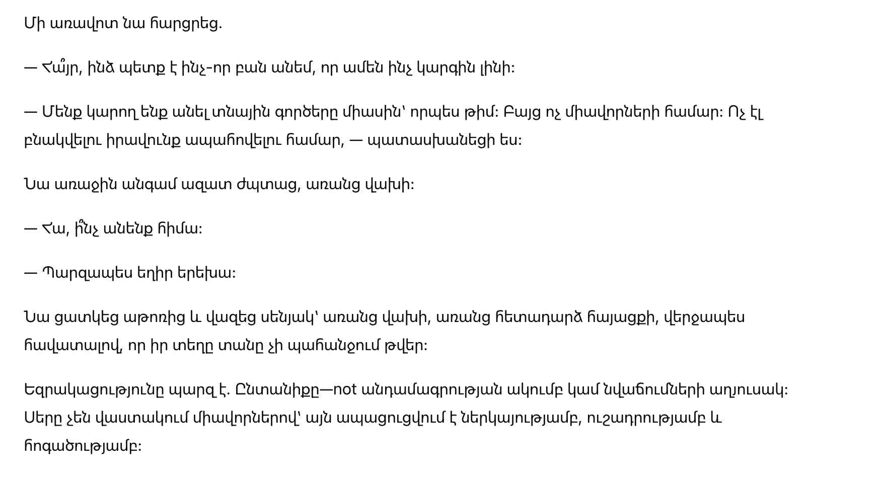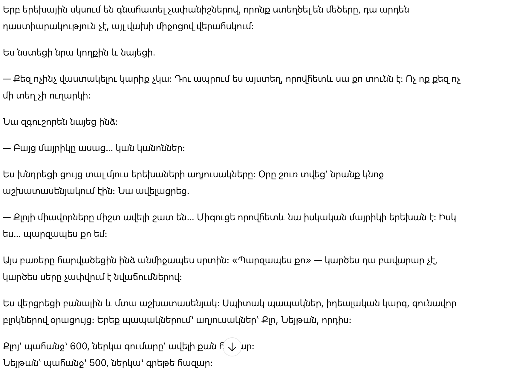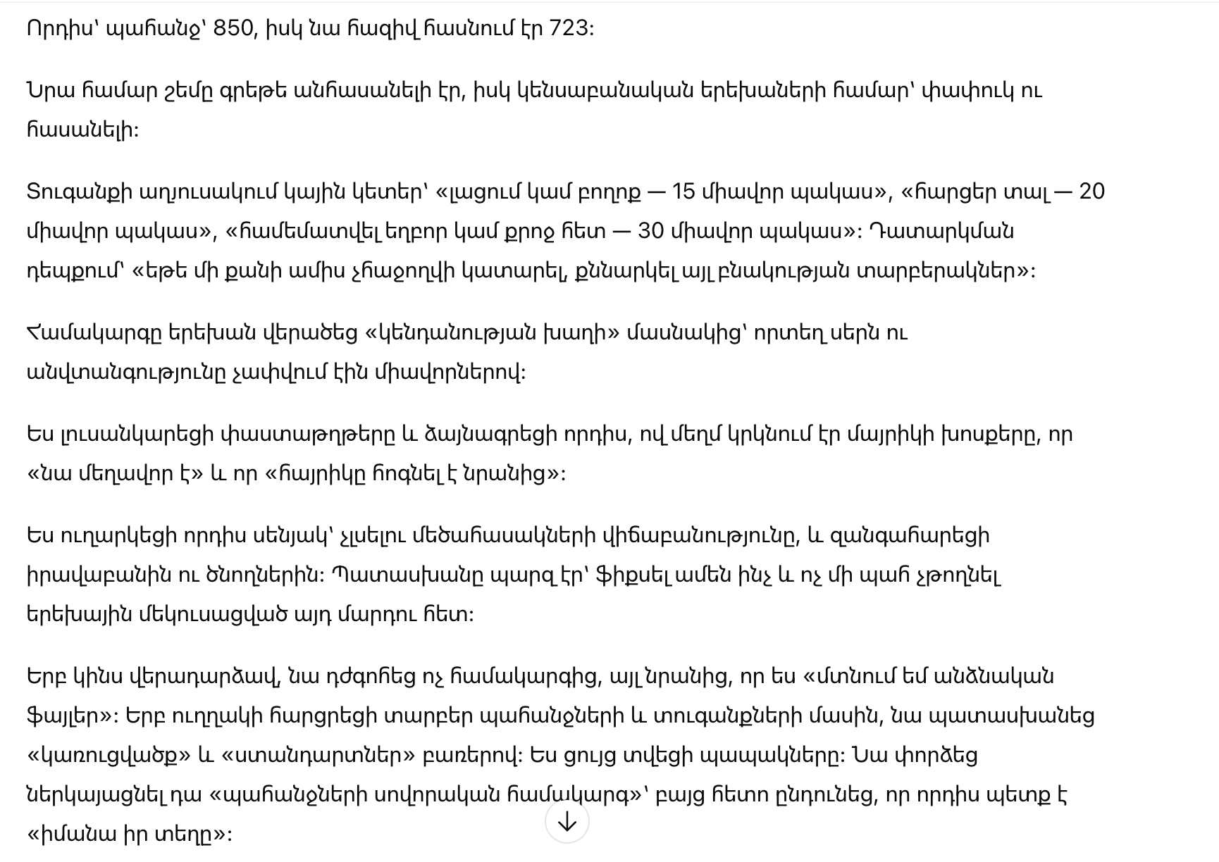 В списке штрафов были пункты вроде «плакал или ныл — минус 15», «задавал вопросы — минус 20», «сравнивал себя с братом или сестрой — минус 30». Внизу приписка: «если не выполнит норму несколько месяцев — обсудить другие варианты проживания».