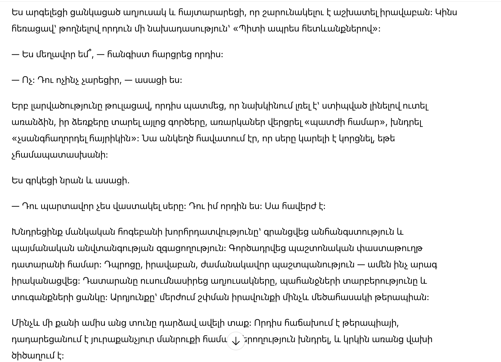 Прошло несколько месяцев. Дом стал теплее. Сын ходит на терапию, перестал извиняться за каждую мелочь и снова смеётся без оглядки.