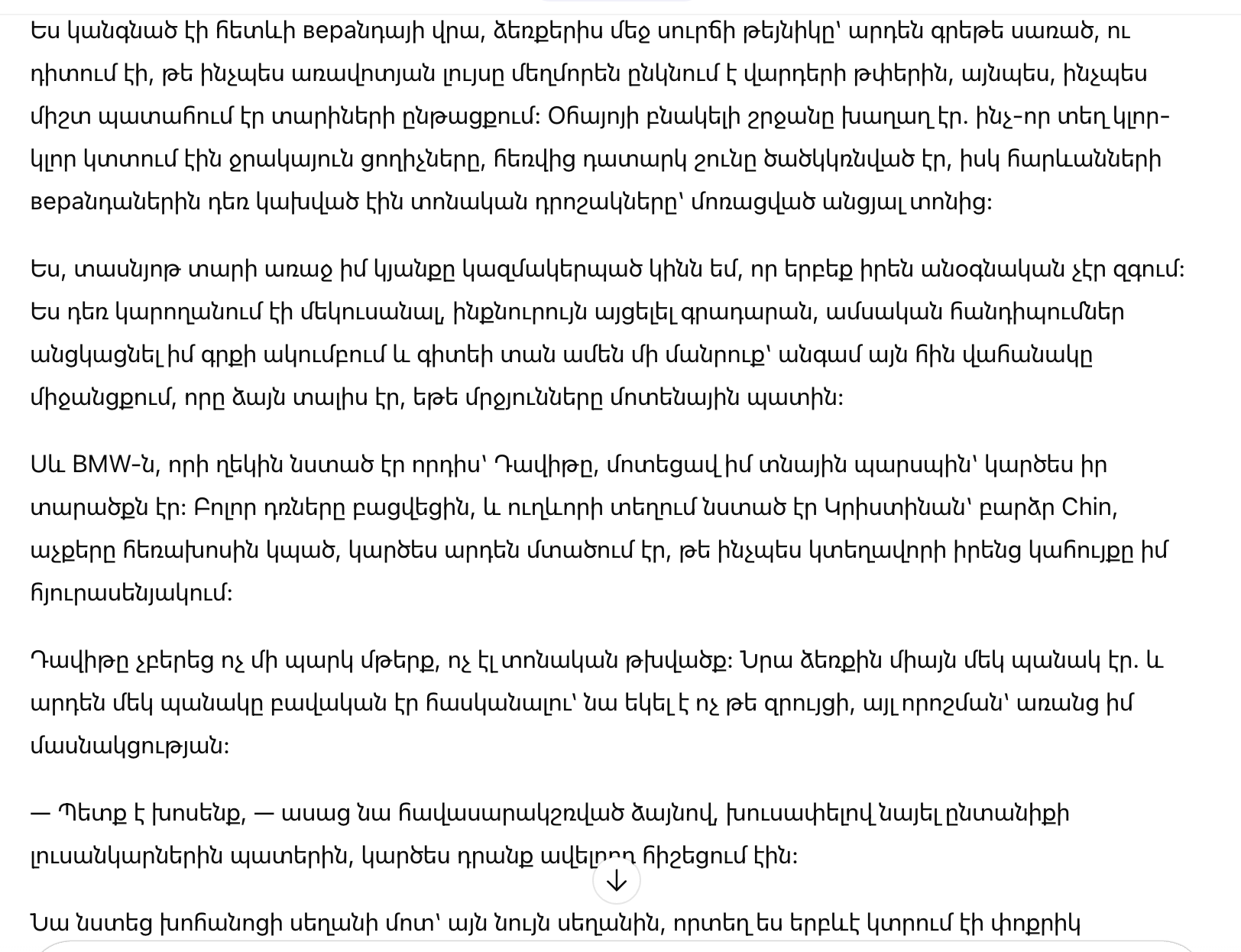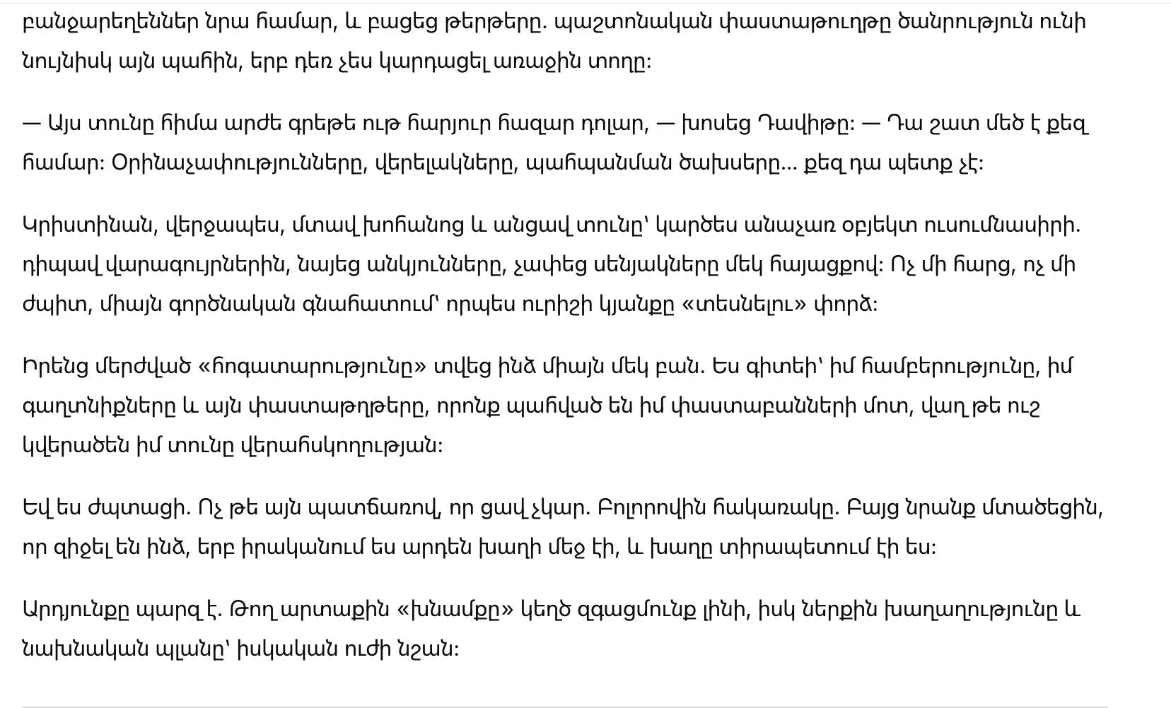 — Этот дом сейчас стоит больших денег. Почти восемьсот тысяч, — произнёс он. — Он слишком большой для тебя. Лестницы, уход, расходы… тебе это не нужно.